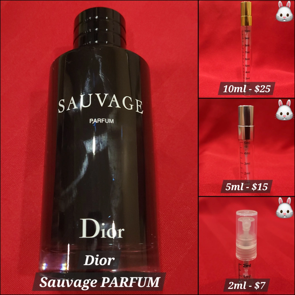 Dior Sauvage Parfum decants available. Choose from 2ml, 5ml, or 10ml sizes. Prices vary depending on size.