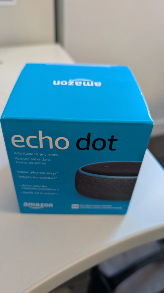 New, unopened Amazon Echo Dot (4th Gen). Charcoal colour. Compact smart speaker. Voice-controlled. Plays music, answers questions, provides weather updates, etc.