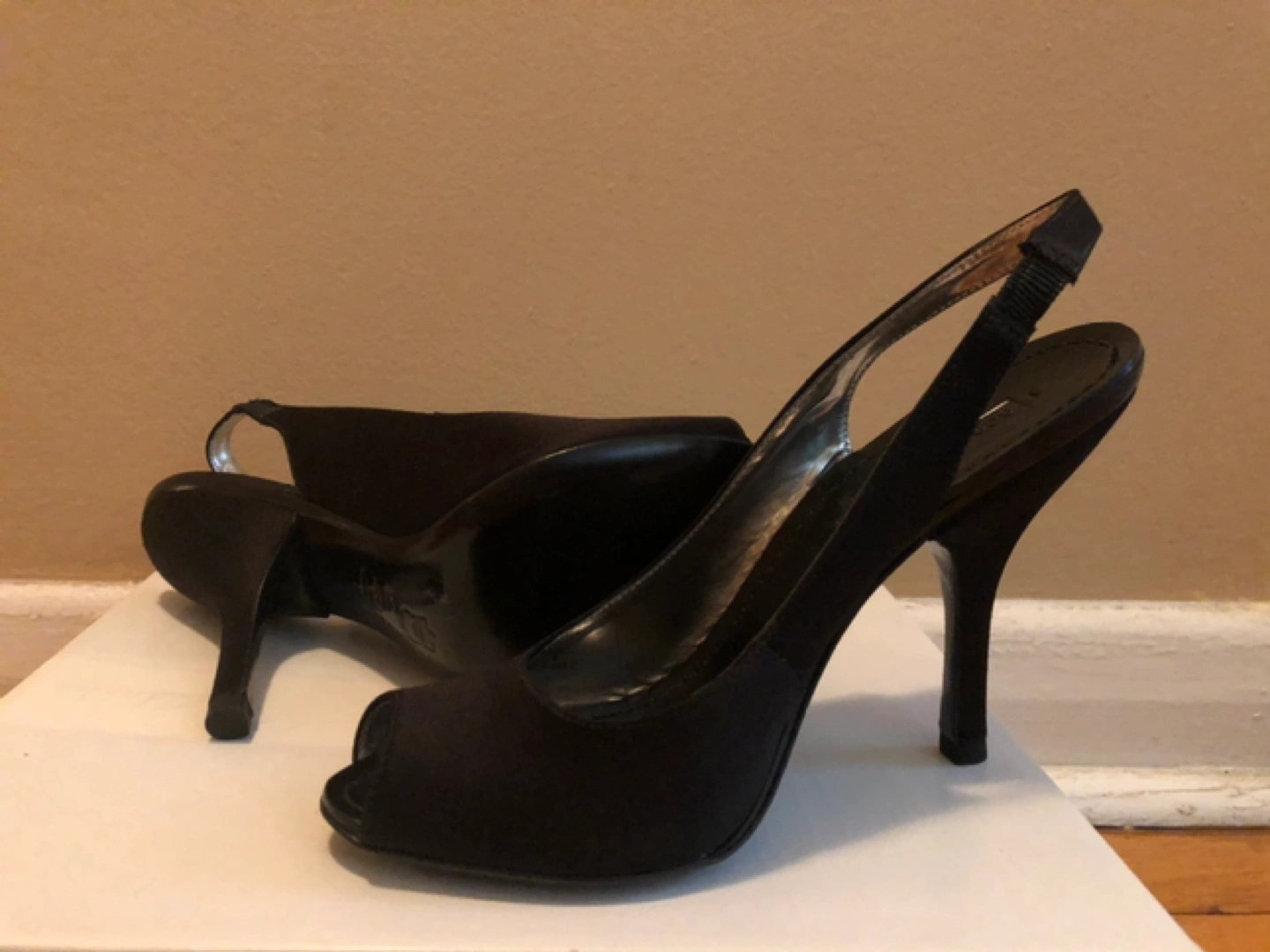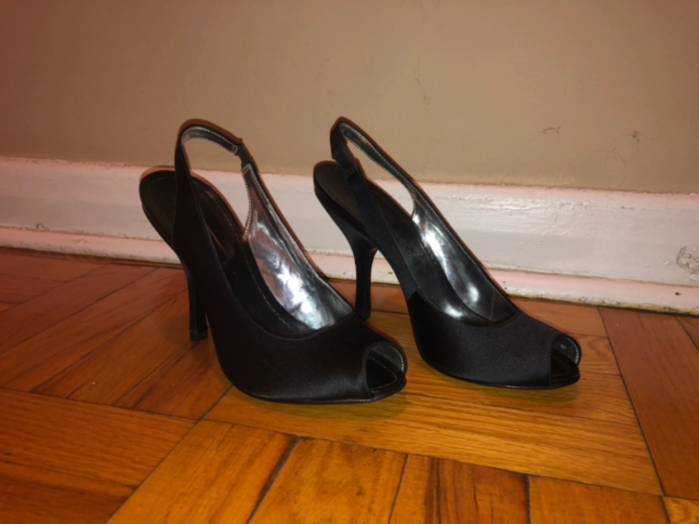 Brand new, never worn. BCBGMaxAzria Black Satin Open Toe Slingback High Heels Size 6.5 (37 Euro) 4” Heels. Excellent condition with no scuffs or knicks to satin. Reason for selling: unfortunately no longer able to wear heels :( Pick up in the Deer Park area (Starbucks Yonge & St. Clair)