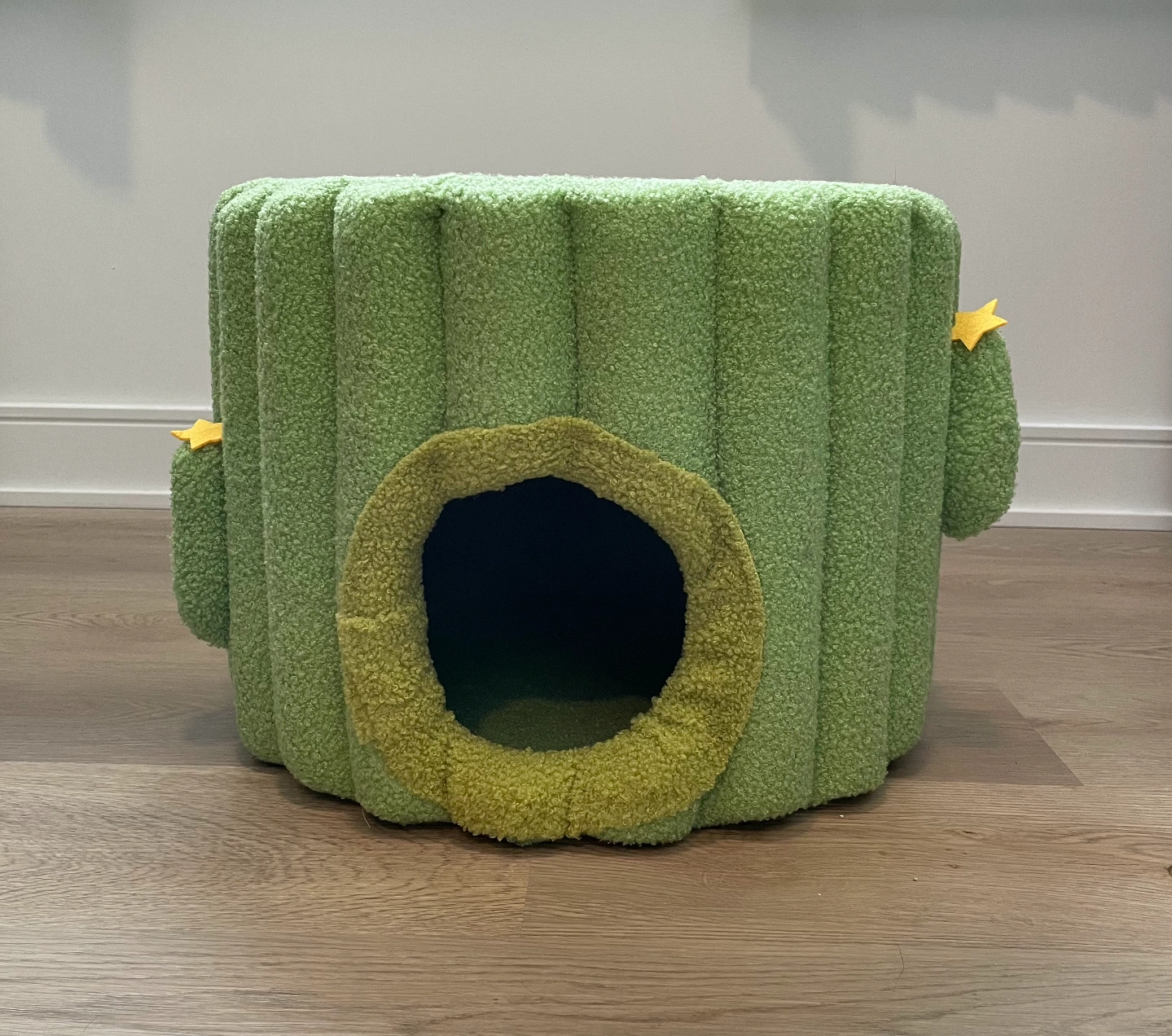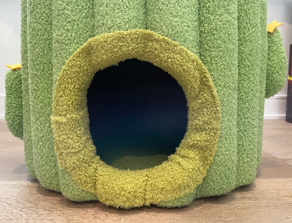 Cute and cozy cat bed shaped like a cactus. Soft, green fabric. Features a round opening for easy access. Yellow stars for decoration. Top features sisal scratching surface.
