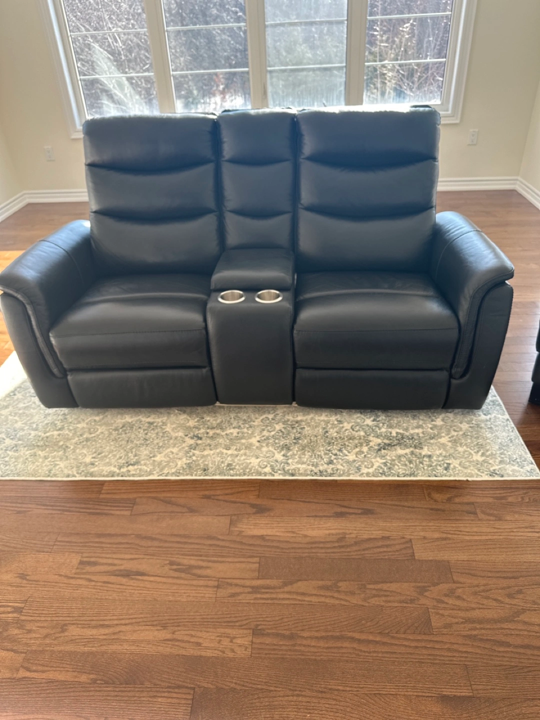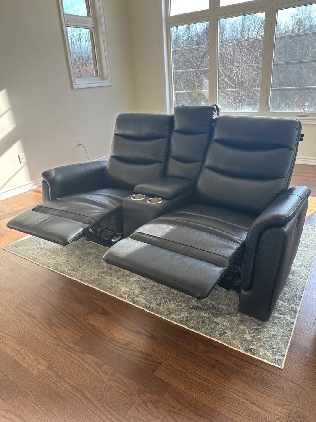 Two-seater reclining loveseat. Black leather upholstery. Cup holders. Power recline.