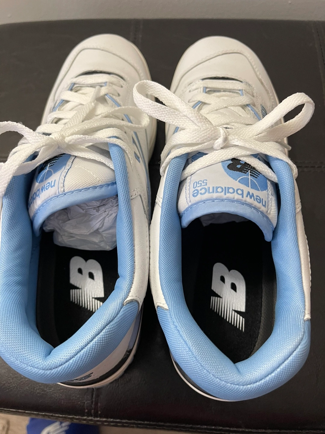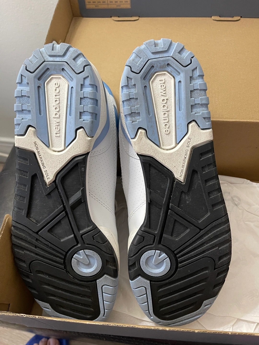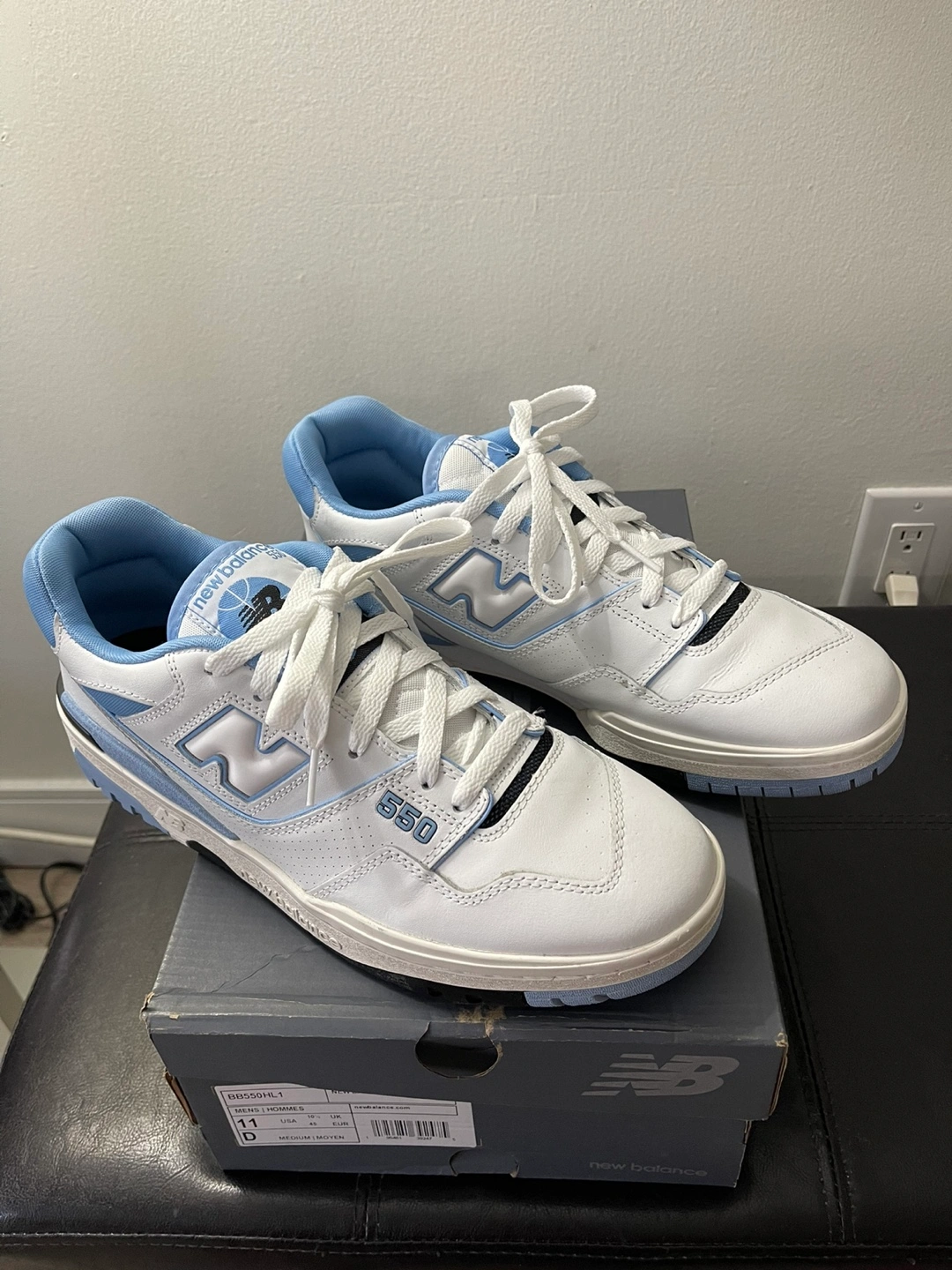 New Balance 550 sneakers. Men's size 11. White leather upper with light blue accents. Brand new in box.