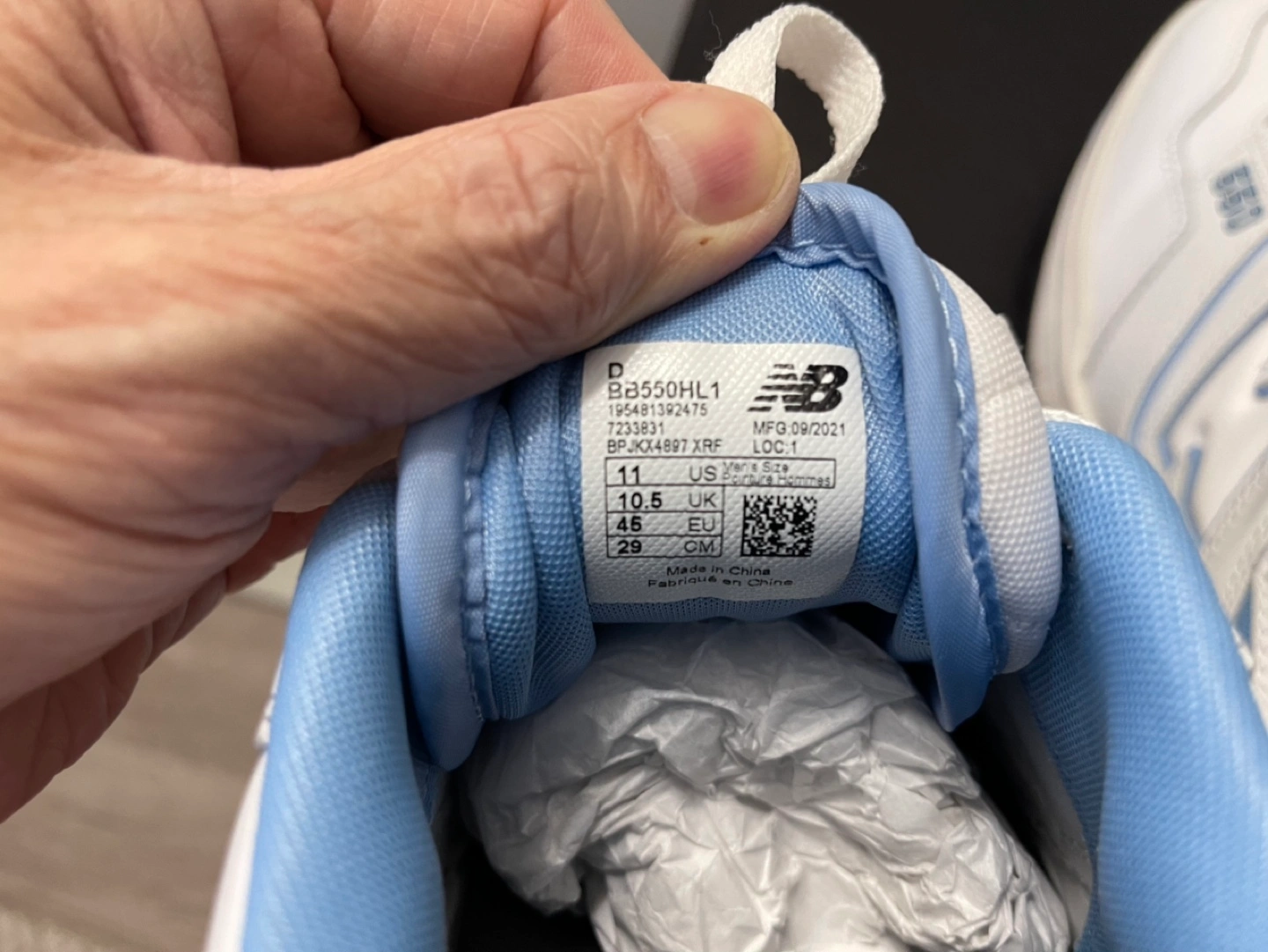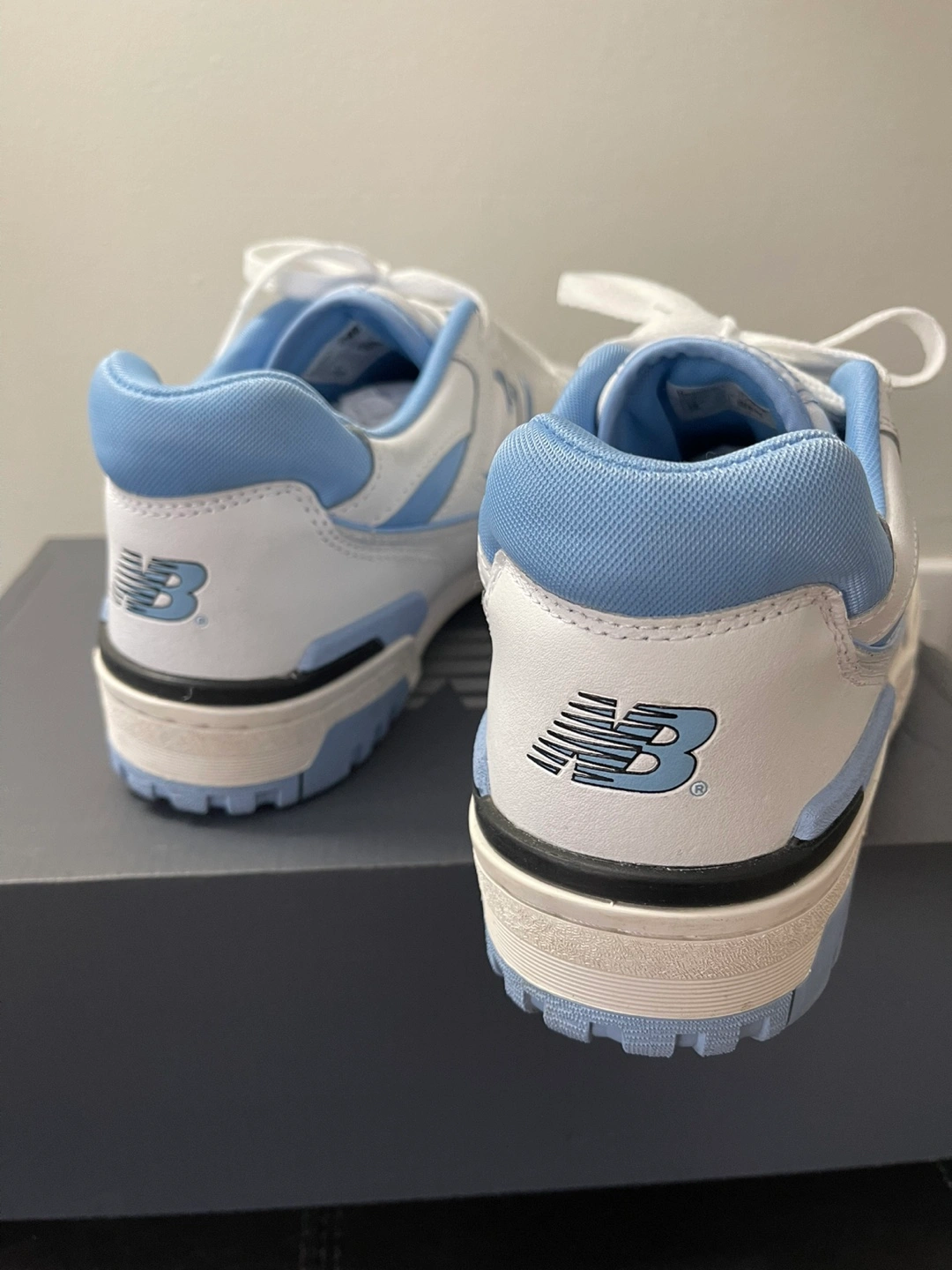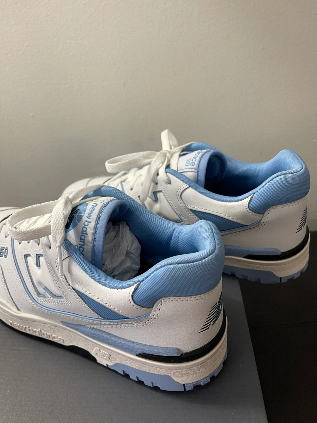 New Balance 550 sneakers. Men's size 11. White leather upper with light blue accents. Brand new in box.