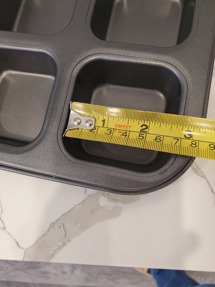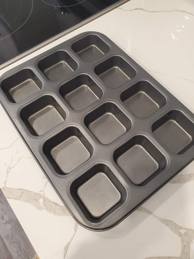 Square baking pan. Great for brownies, muffins, or other treats. Each square measures approximately 2.5".