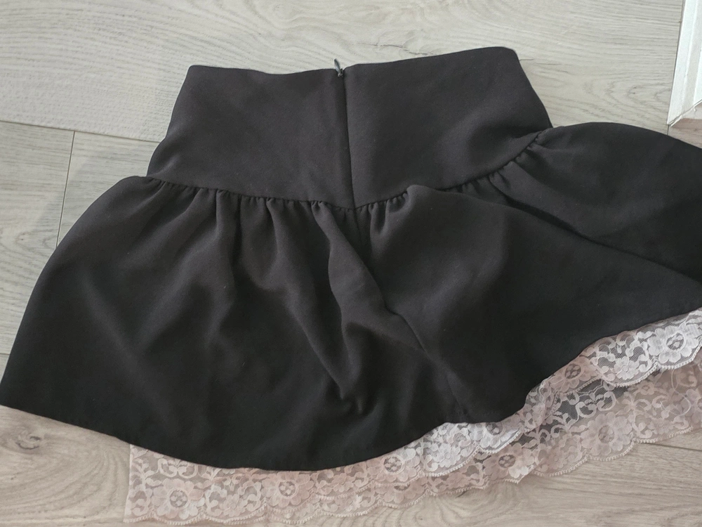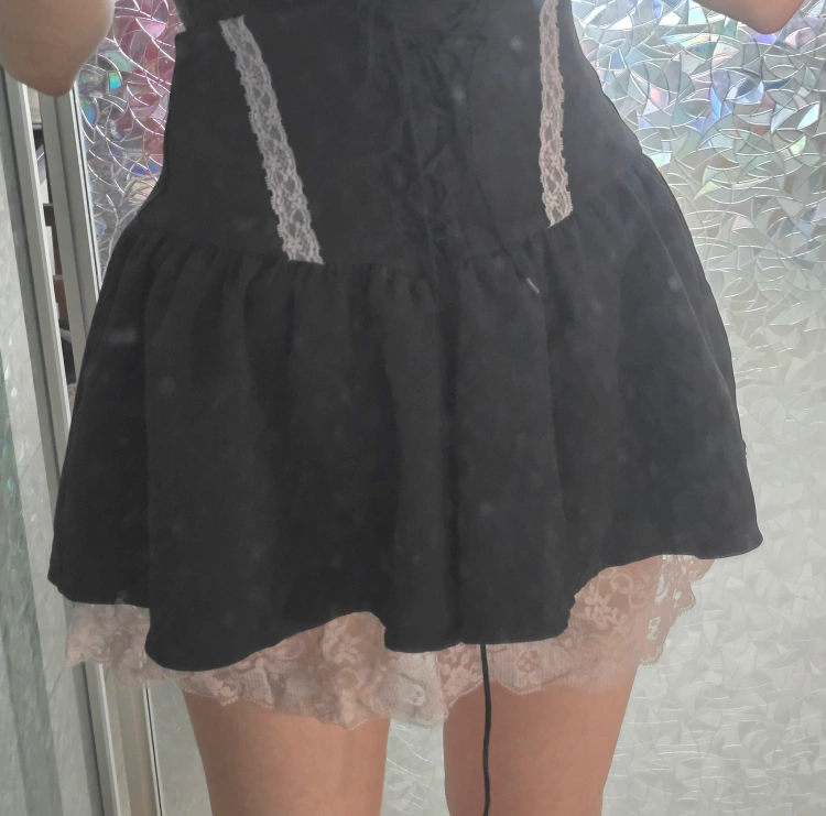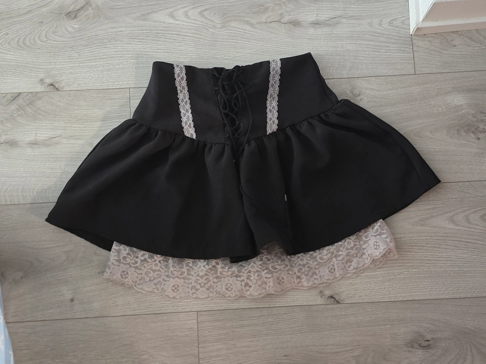 Cute black mini skirt. Features a lace trim and corset-style lacing in the front. Layered look with a peek of lace underneath.