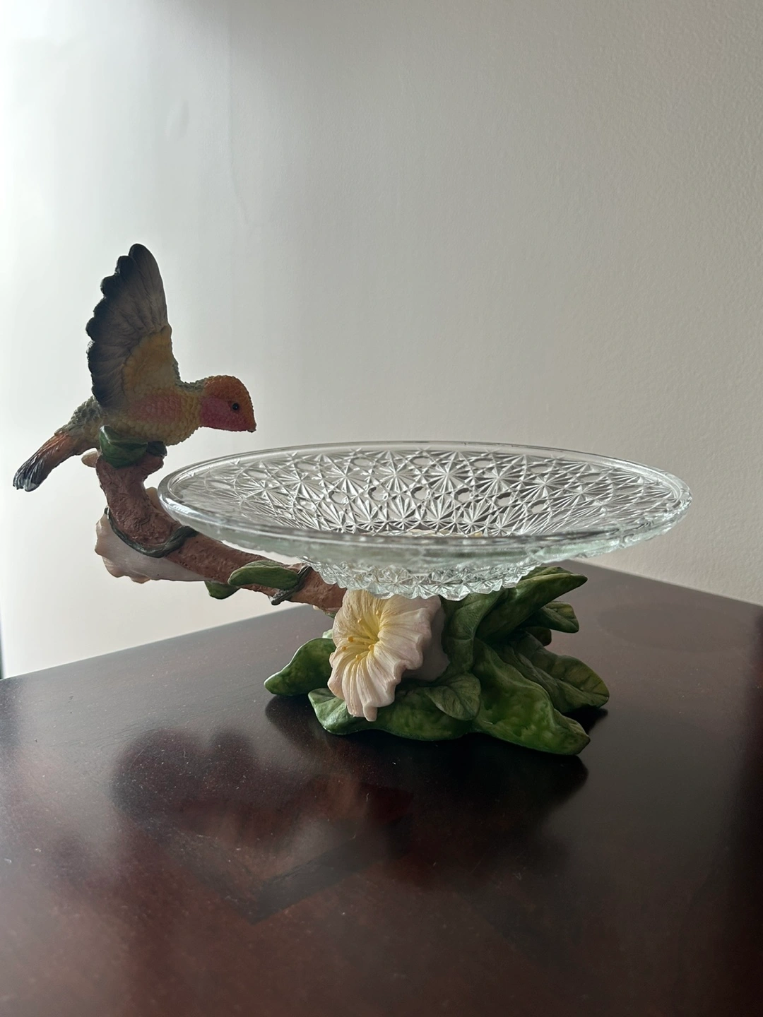 Unique decorative bowl featuring a sculpted bird and floral base. Clear crystal bowl sits atop a detailed resin bird and flower stand. Perfect for candy, jewellery, or decorative purposes.