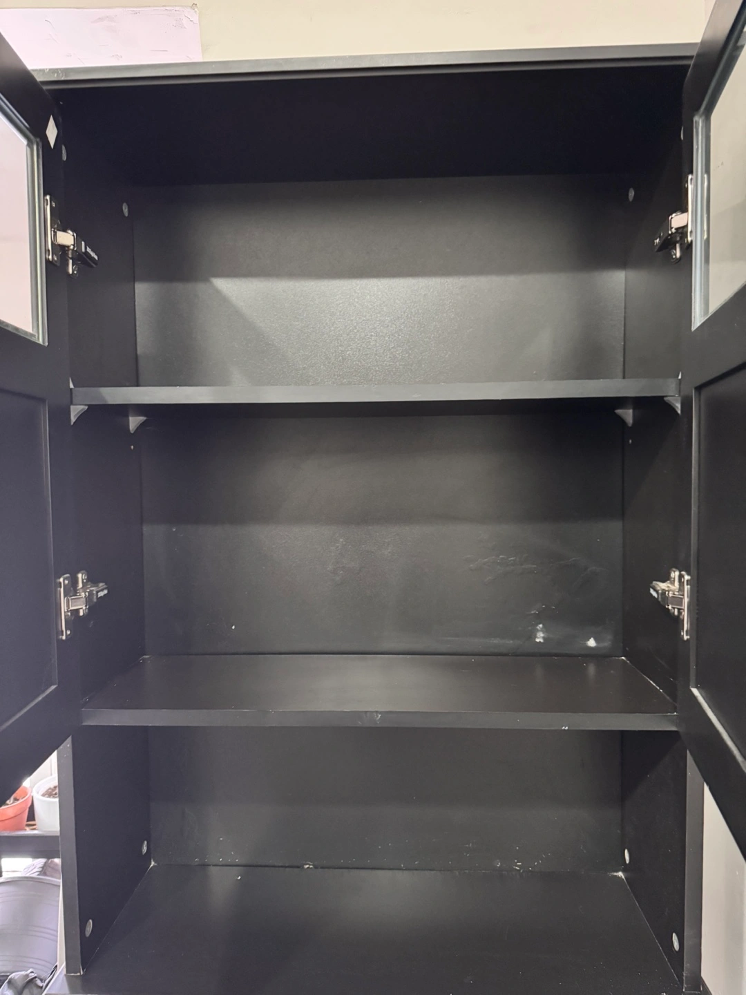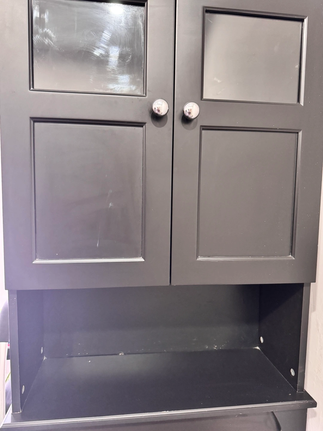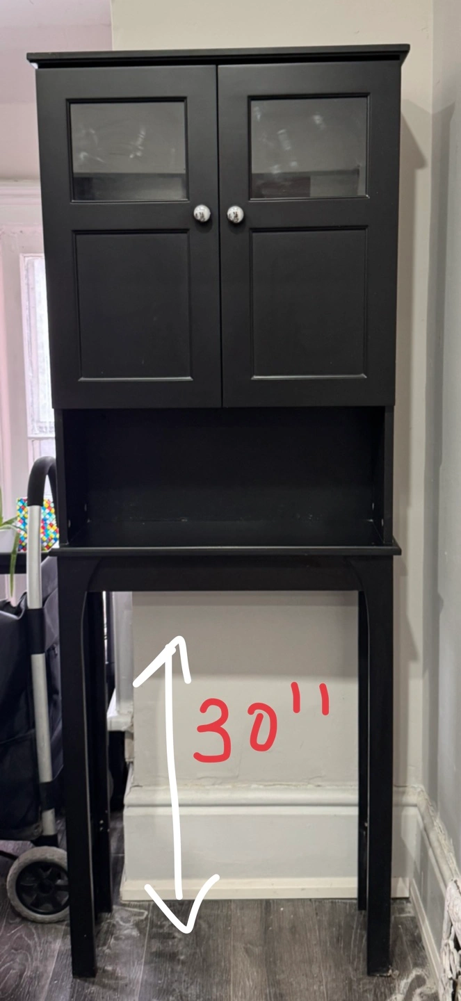 Freestanding bathroom cabinet. Black wood finish. Two doors with glass panels. Open shelf below. Two interior shelves. Chrome knobs. Height -70 inches Depth -9 inches Width- 25 inches Pickup at Sherboune and Dundas