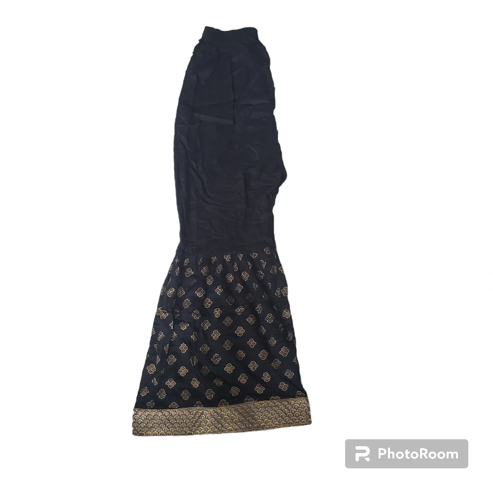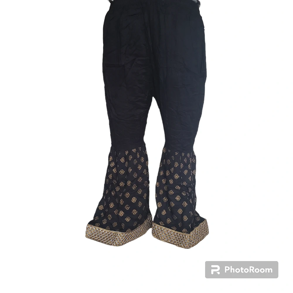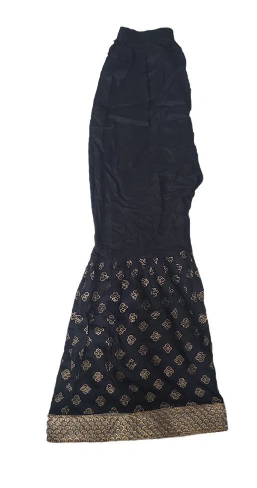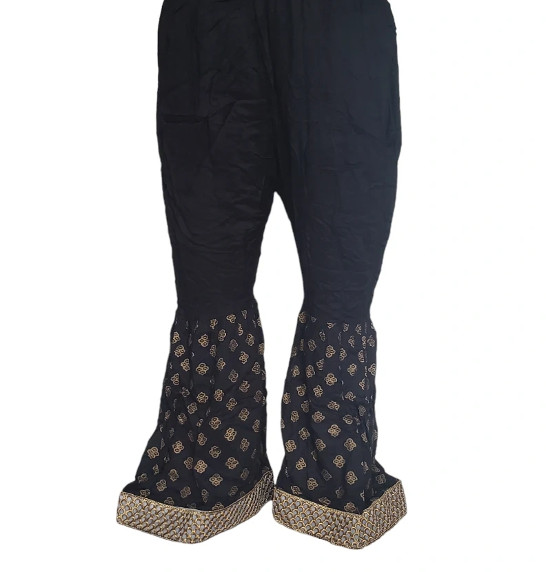 Women's flared trousers/ gharara pants. Black with gold detailing. Elastic waistband. Flared legs. Embellished cuffs.