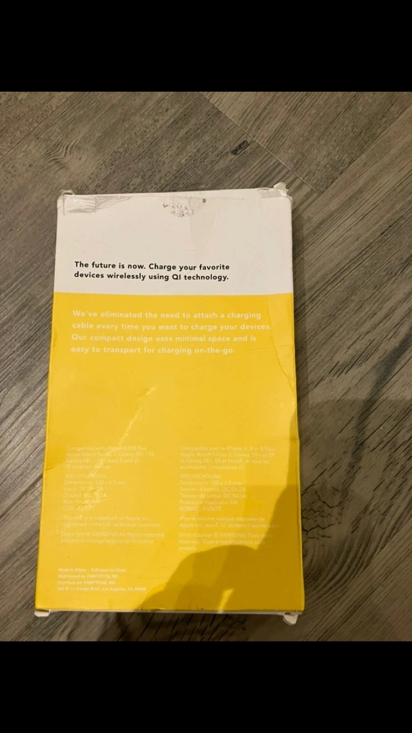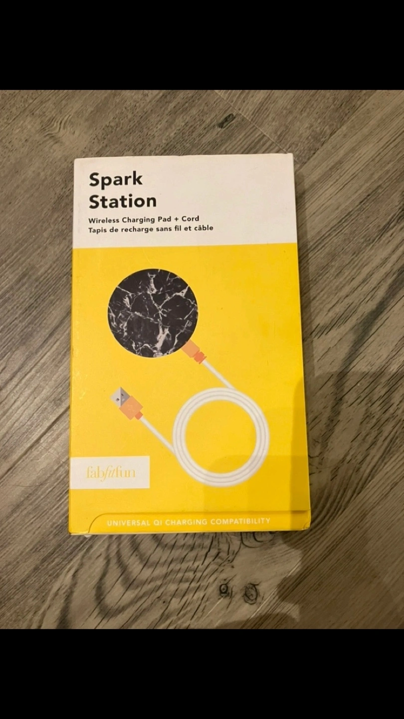 A wireless charging pad with a marble design and a cord. It is a universal Qi charging device. It comes in its original box. If you buy something else from me you can have this for free.