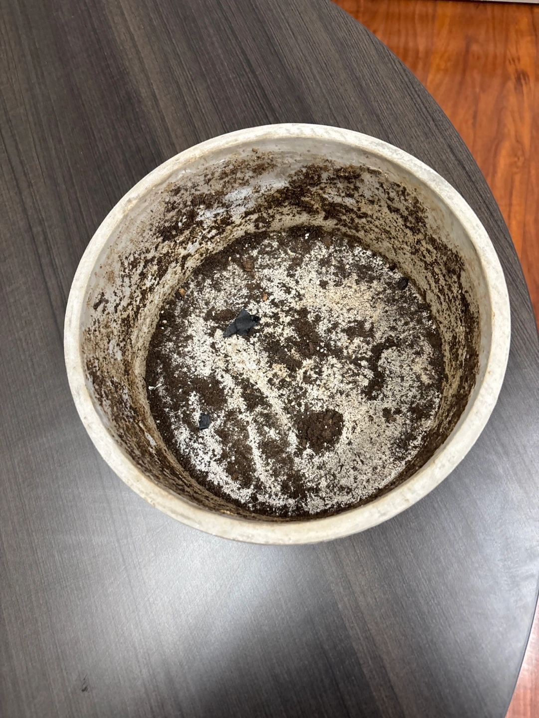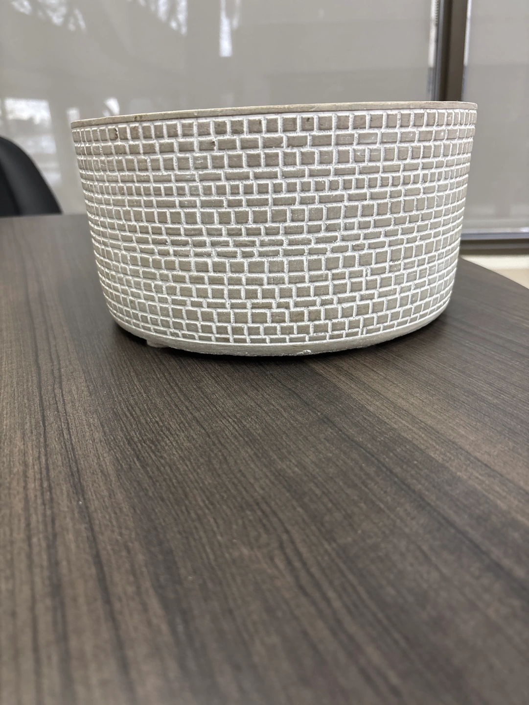 Round grey planter. Small brick pattern. Previously held a plant, residue remains. Suitable for indoor or outdoor use. Good condition. 10 inches round