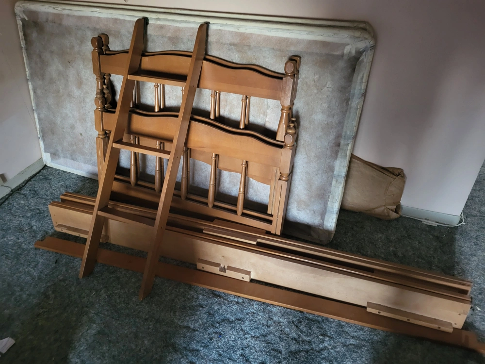 Solid wood parts for bunk beds, including the ladder. I have not been able to find the dowelling the hold the beds together – a trip to a building supply for some round doweling and a saw will fix that! Other than the dowelling, some mattresses will complete the package!