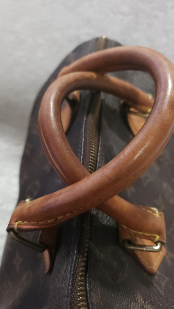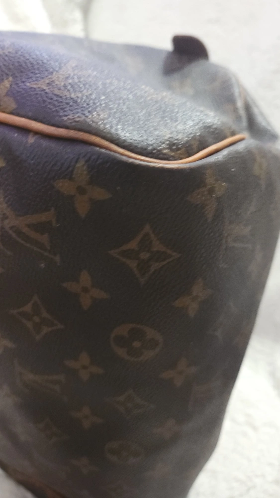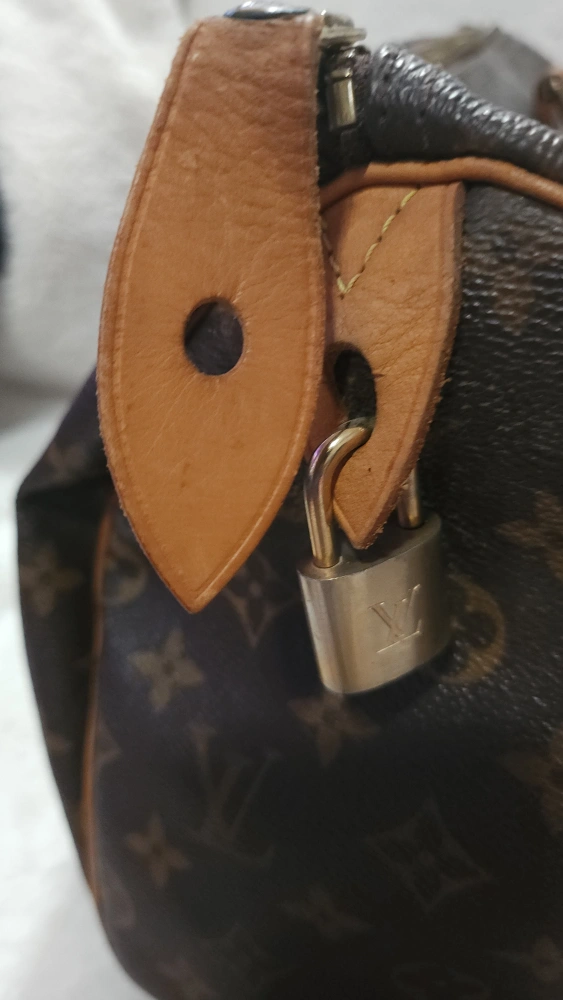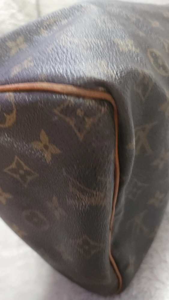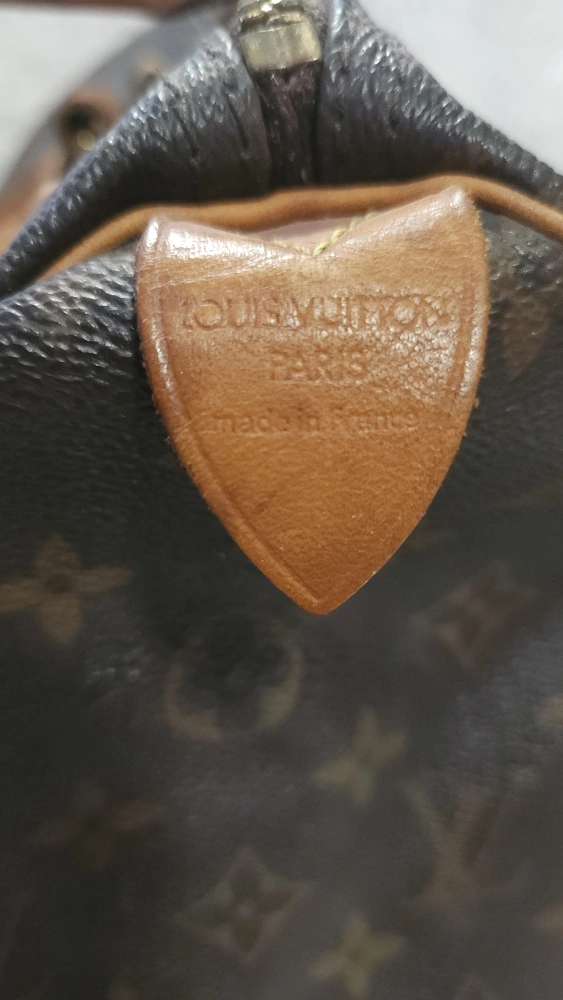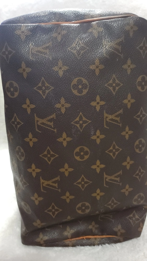65Pre-loved Louis Vuitton Speedy 25 handbag. Classic Monogram canvas. Brown leather trim. Zip closure. Well-used, shows signs of wear.