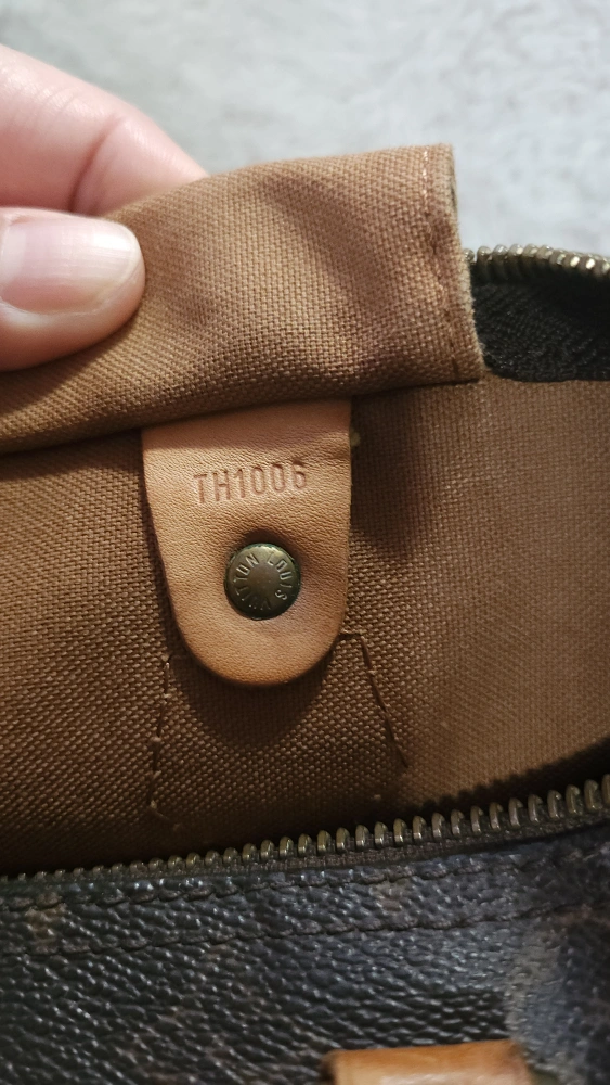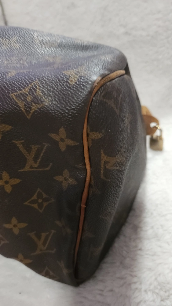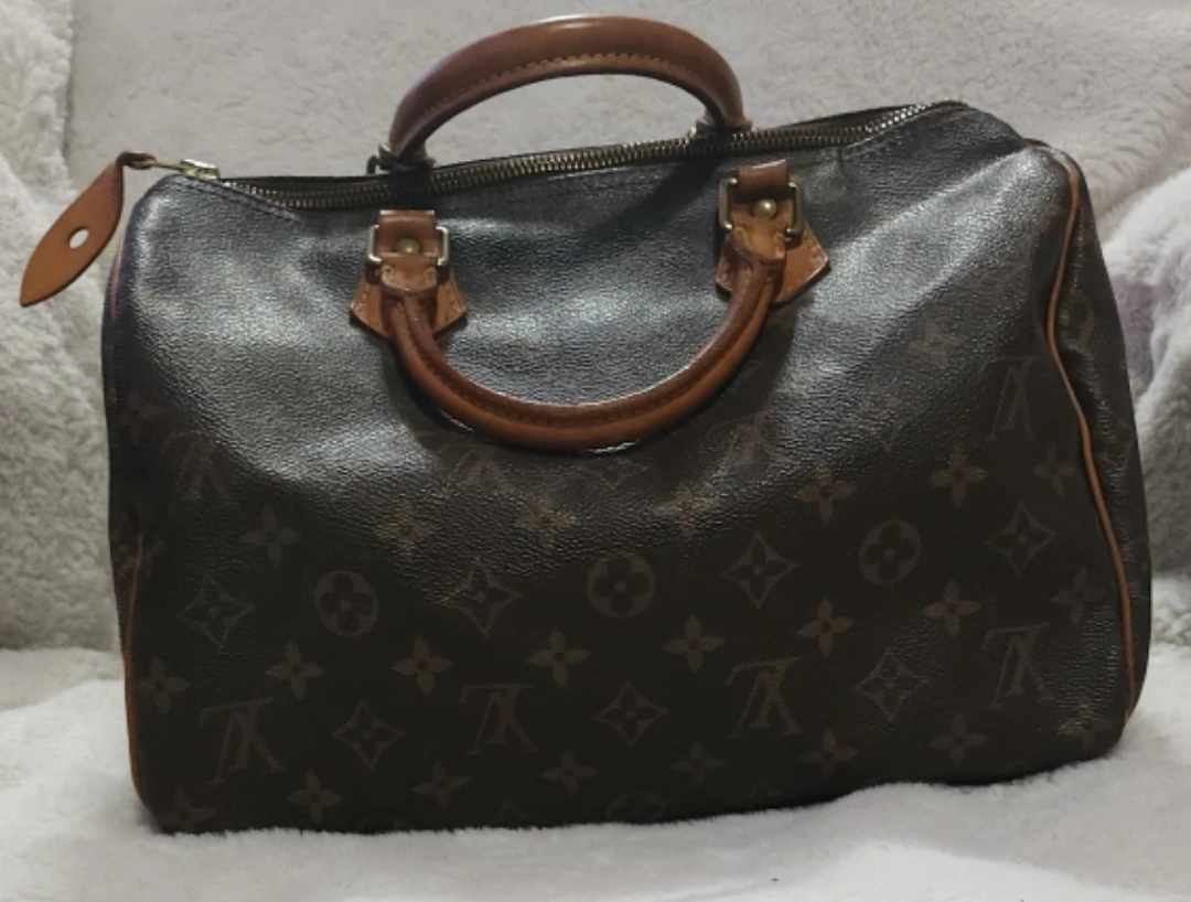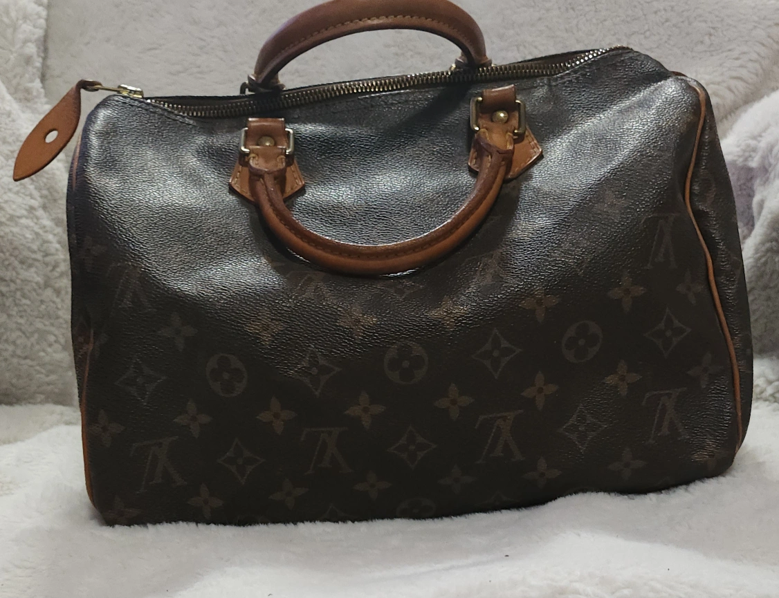 65Pre-loved Louis Vuitton Speedy 25 handbag. Classic Monogram canvas. Brown leather trim. Zip closure. Well-used, shows signs of wear.