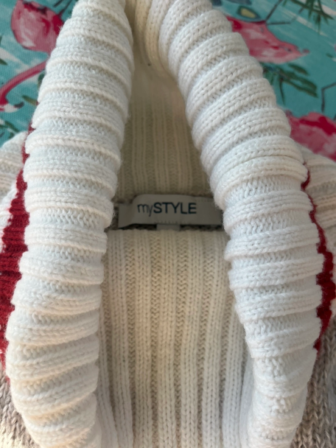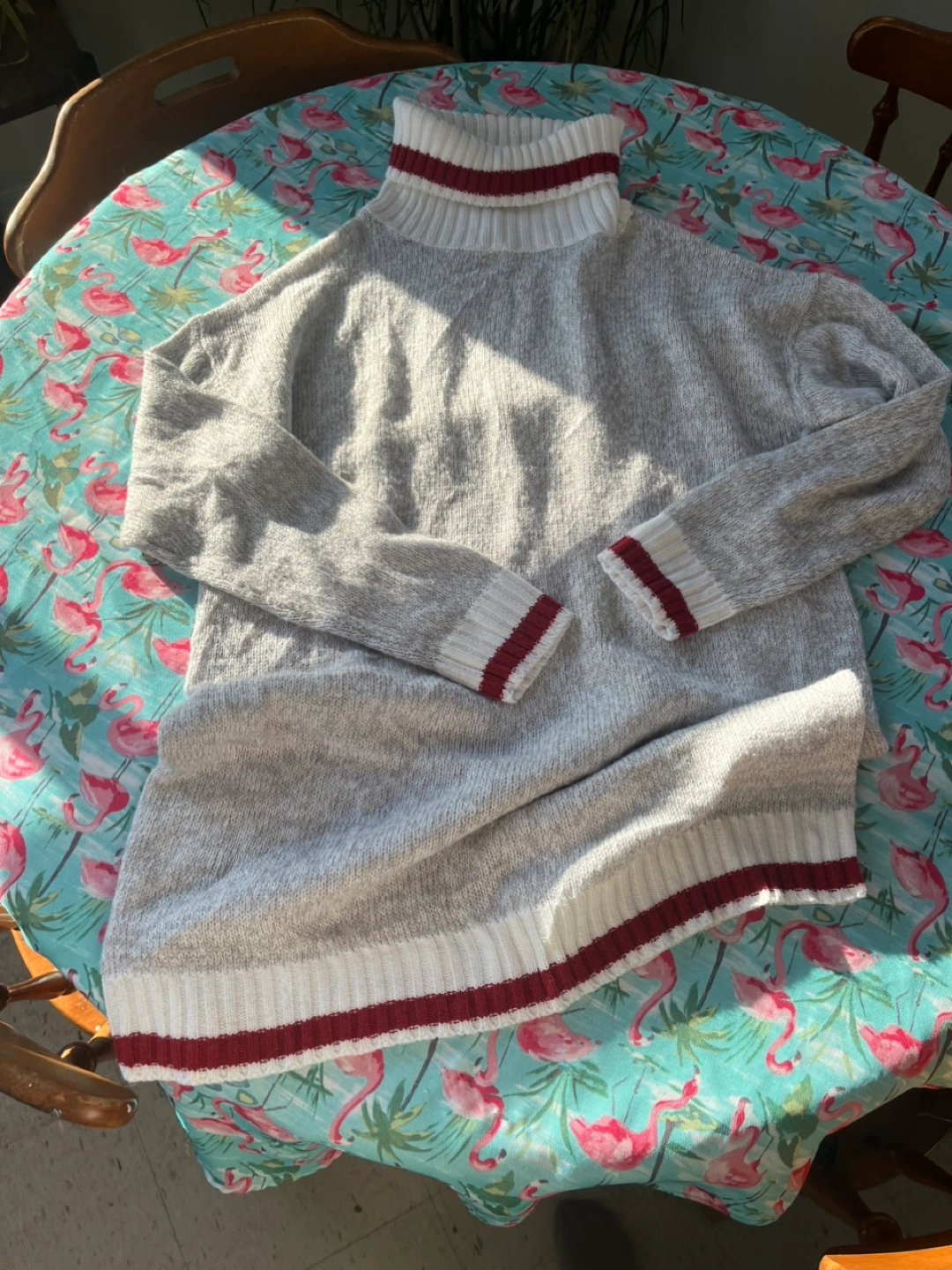 Reserved! This cozy turtle neck sweater is not itchy. Features red and white striped ‘work sock’ accents at the cuffs and hem. It is in like new condition and is long, past bum. For me I prefer a slightly beige tinge to the white which this does not have. This is perfect if you are a Summer or Winter; I am a Spring:) I think it is a loose medium.