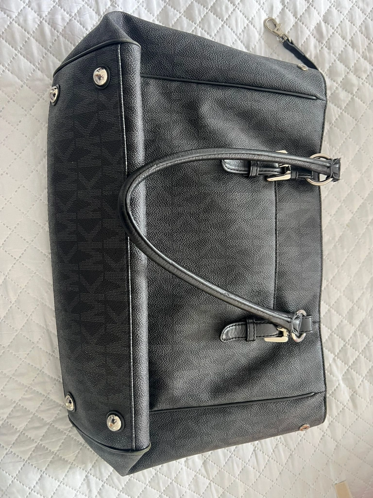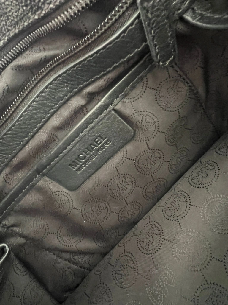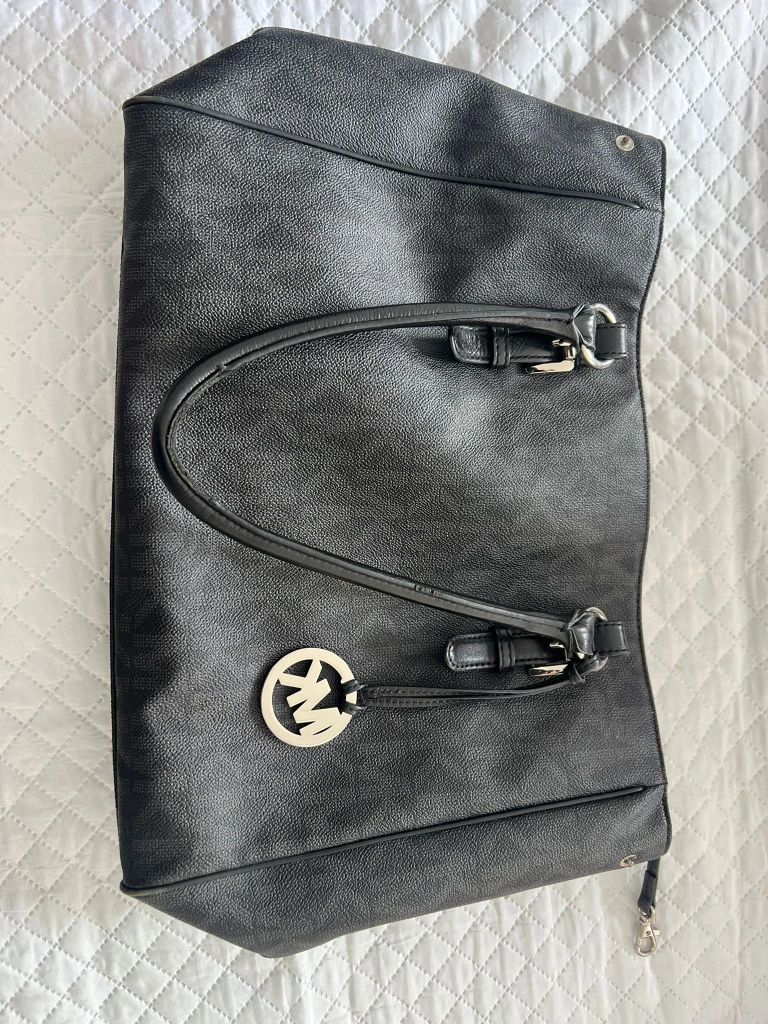 Large black tote bag. Features MK logo. Double top handles. Zip closure. Interior pockets. Excellent for everyday use.