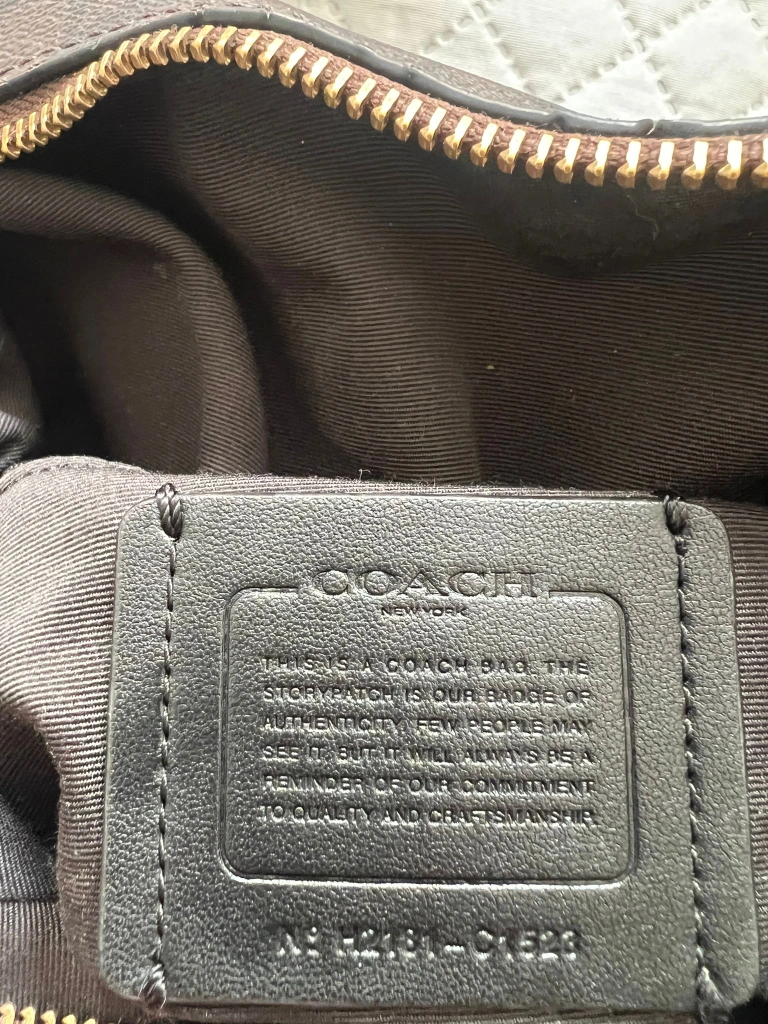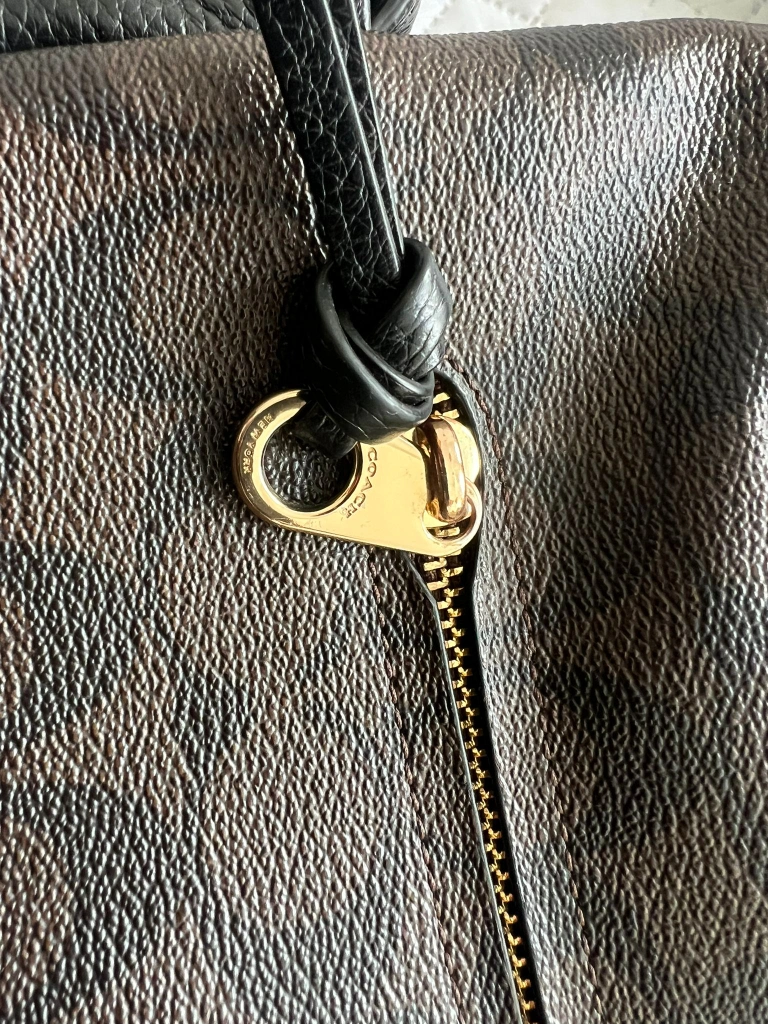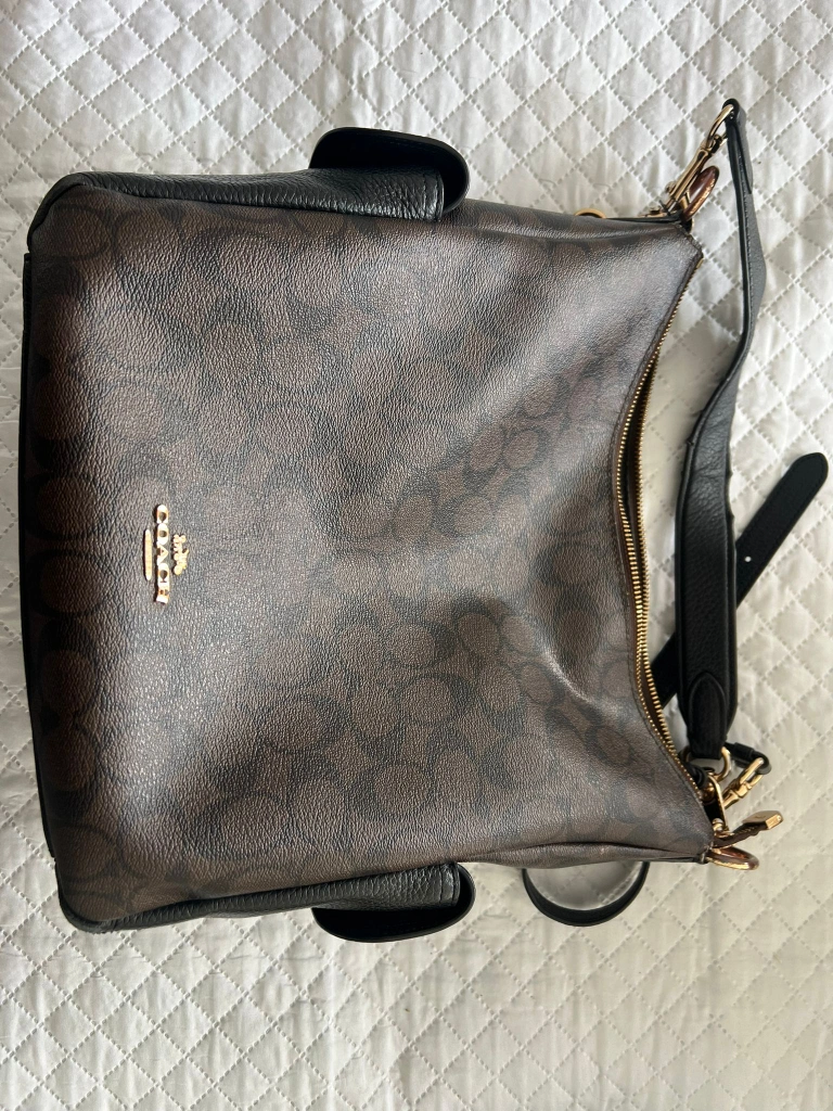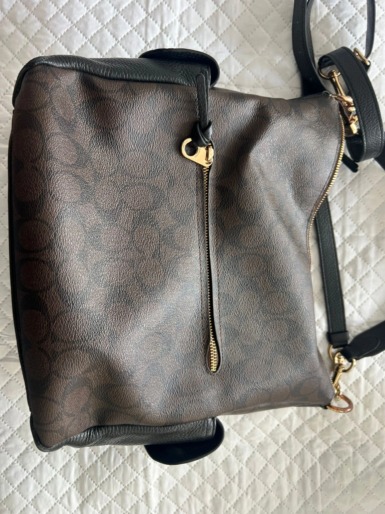 Brown and black leather shoulder bag. Features a zip closure and adjustable strap. Gold-toned hardware. Excellent condition.
