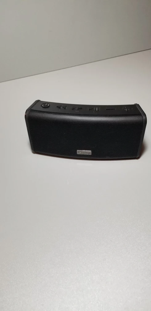 portable Bluetooth speaker. Features volume controls and playback buttons. Compact and easy to transport.