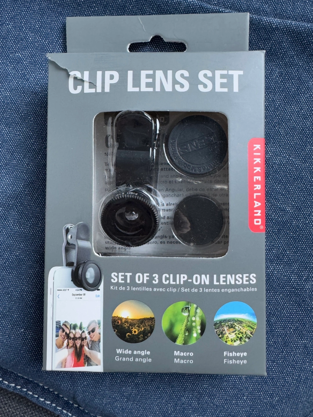 Set of 3 clip-on lenses. Includes fisheye, wide angle, and macro lenses. Carrying pouch. Attaches to smartphone or tablet.