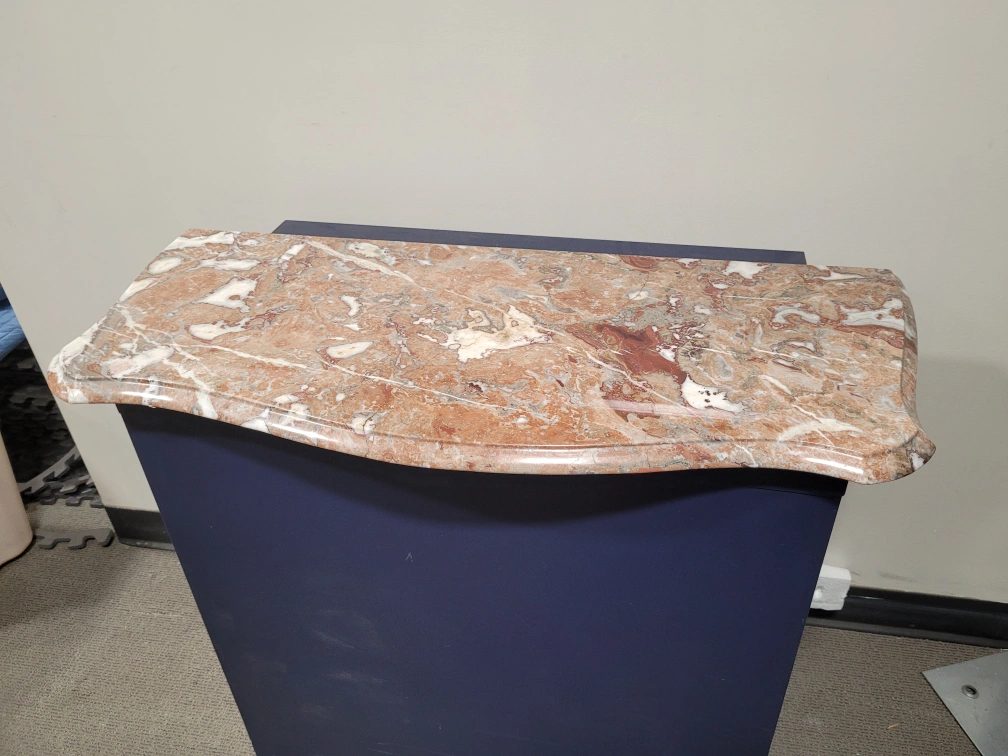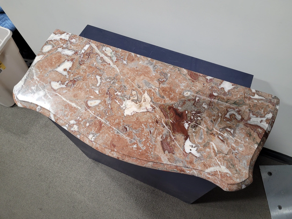 Beautiful marble countertop. Unique colouring and pattern. Curved edges. Suitable for various applications. metal stand is made to mount to the wall.