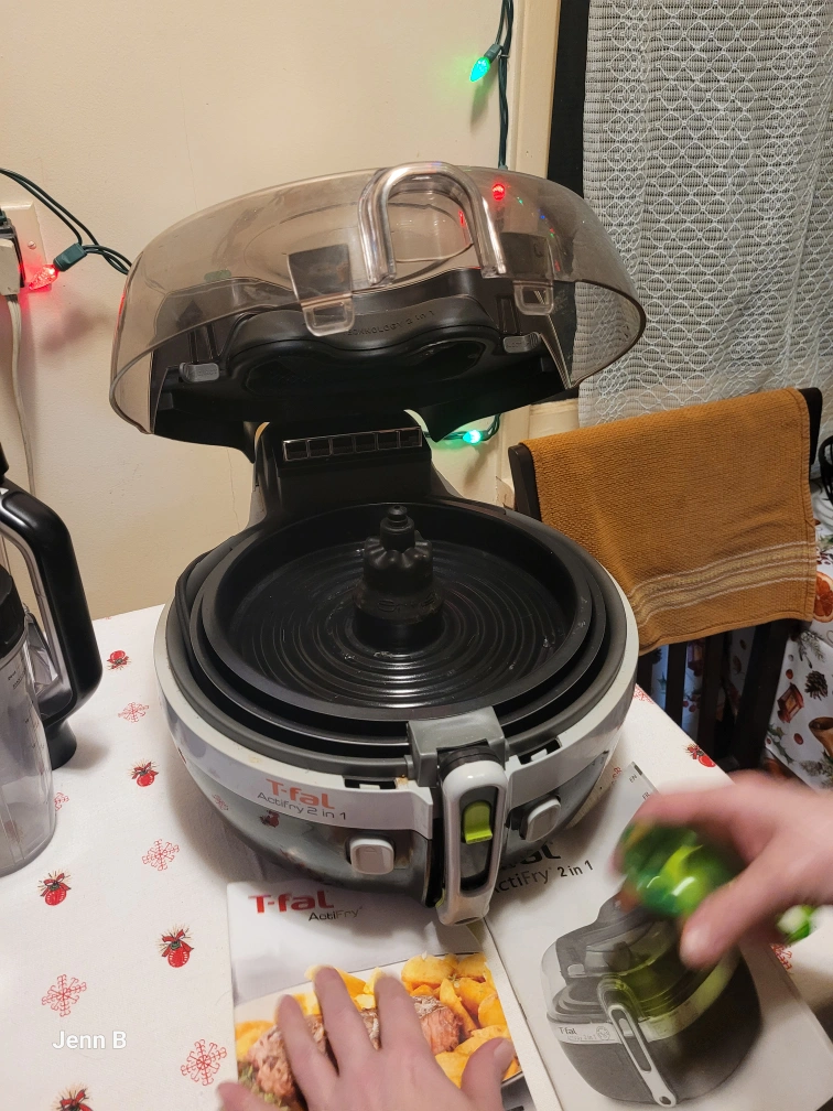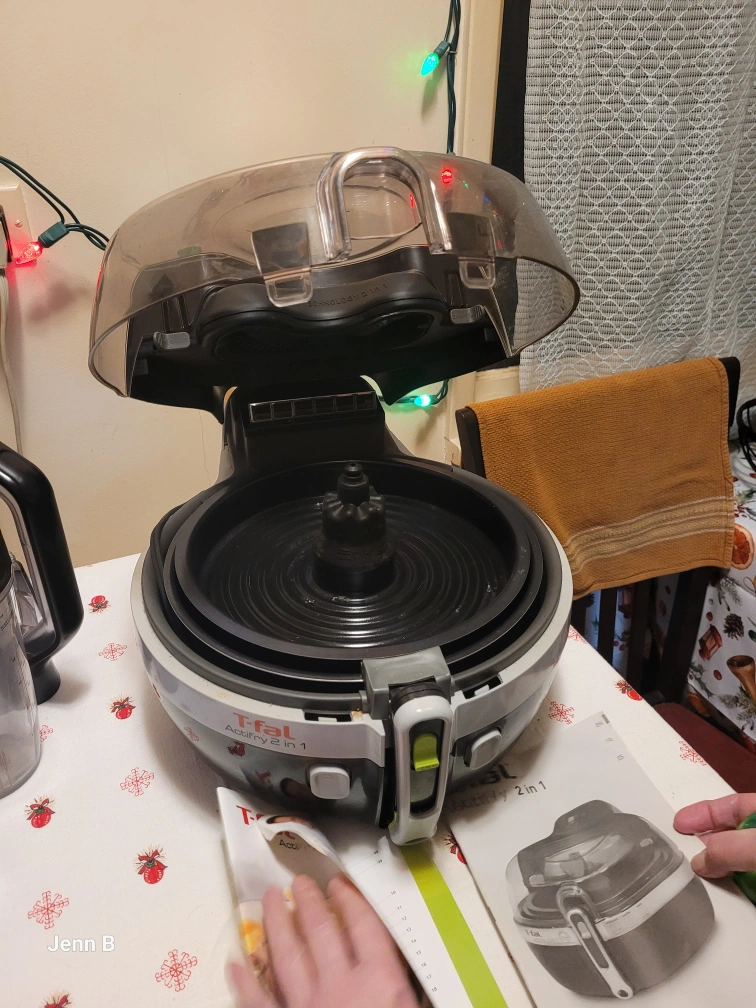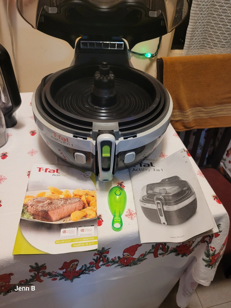 T-fal Actifry 2 in 1 air fryer. Great for healthy cooking. Includes instruction booklet and cleaning utensil.