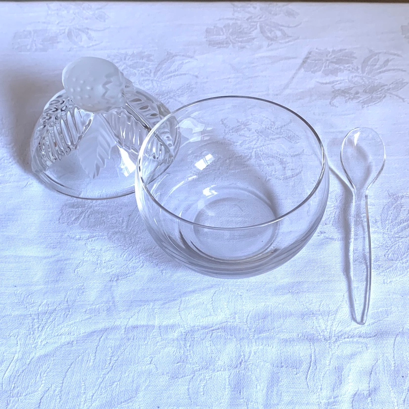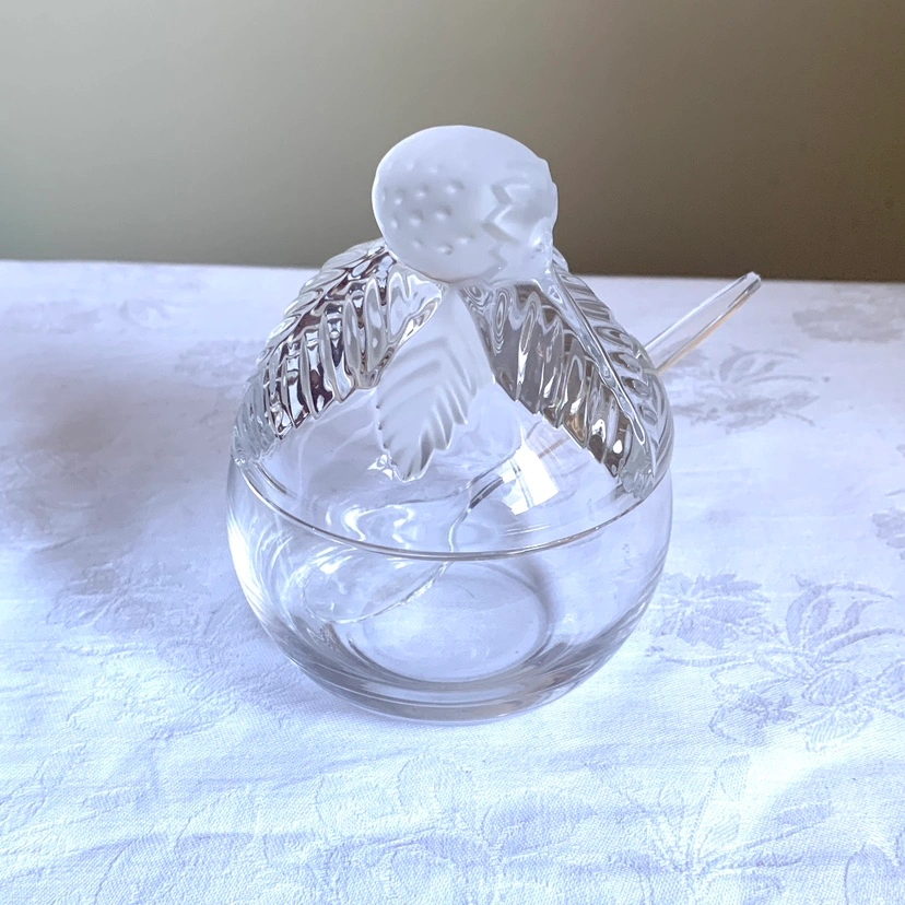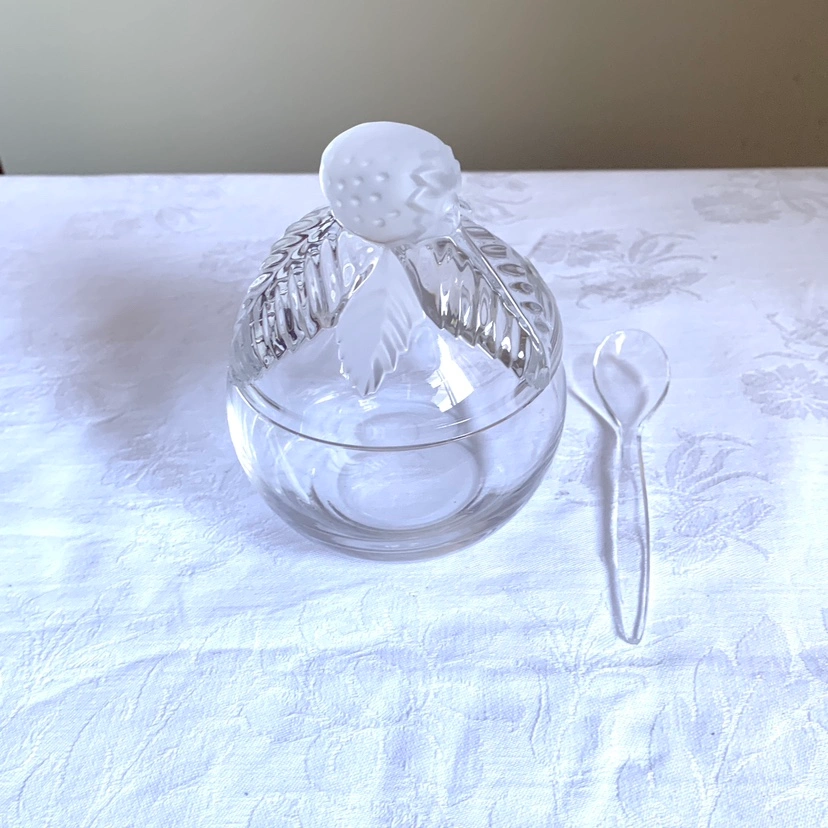 Clear glass jar with a decorative lid and matching spoon. Strawberry shaped handle on top. Etched leaf decorative motif.