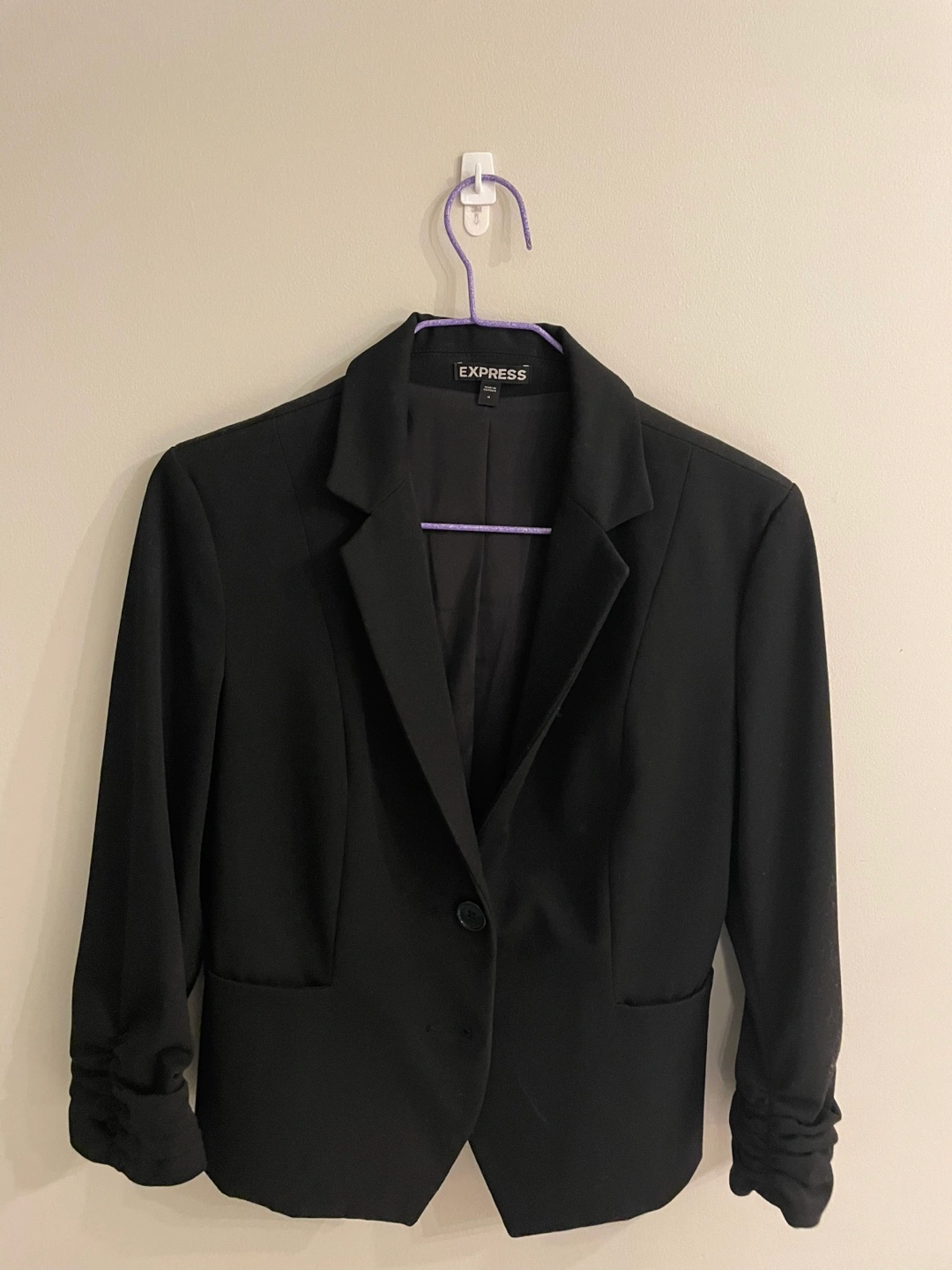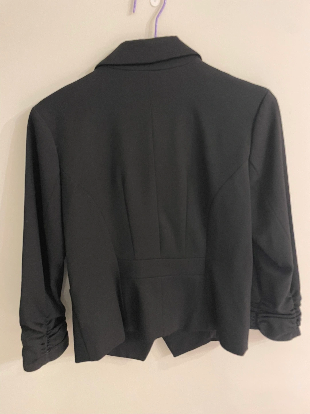 Three-quarter sleeves with ruched cuffs. One button closure. Cropped length.