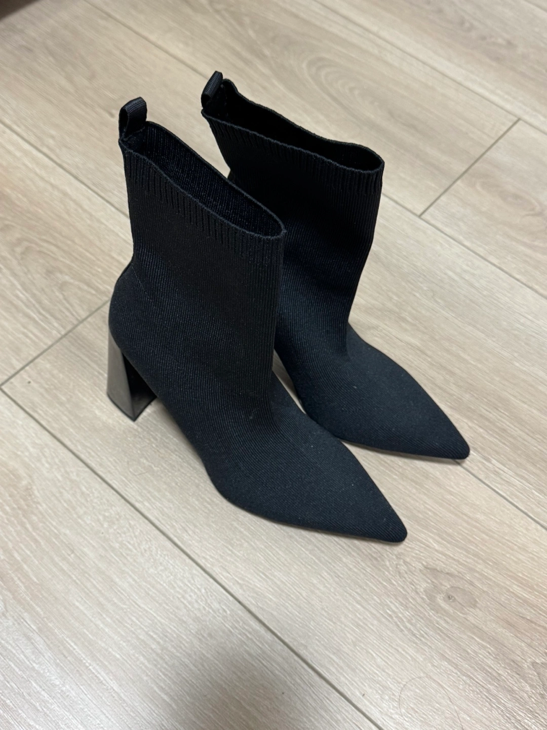 39Pair of black knit sock boots. Pointed toe. Block heel. Size 7.