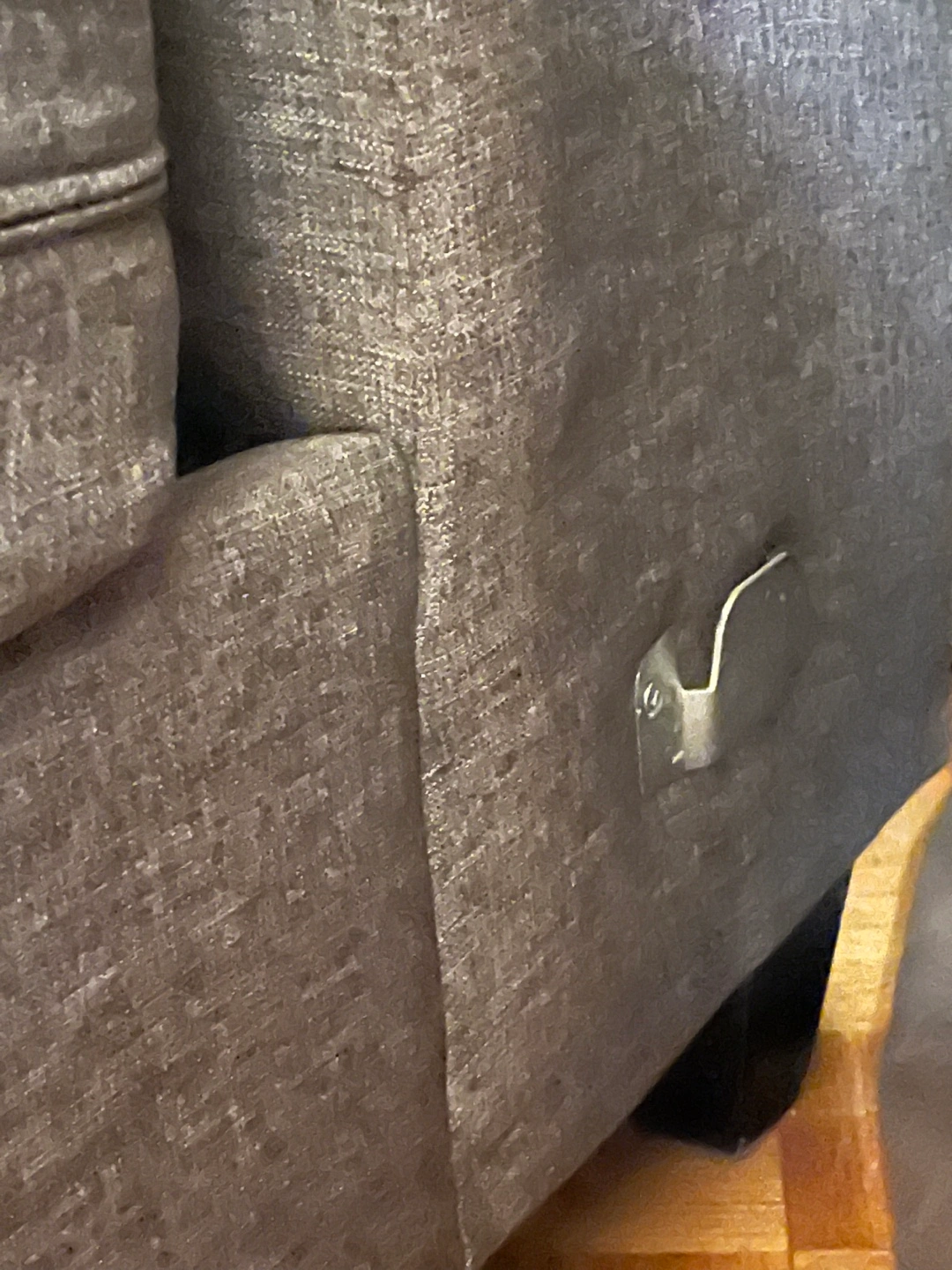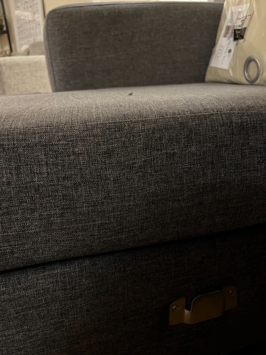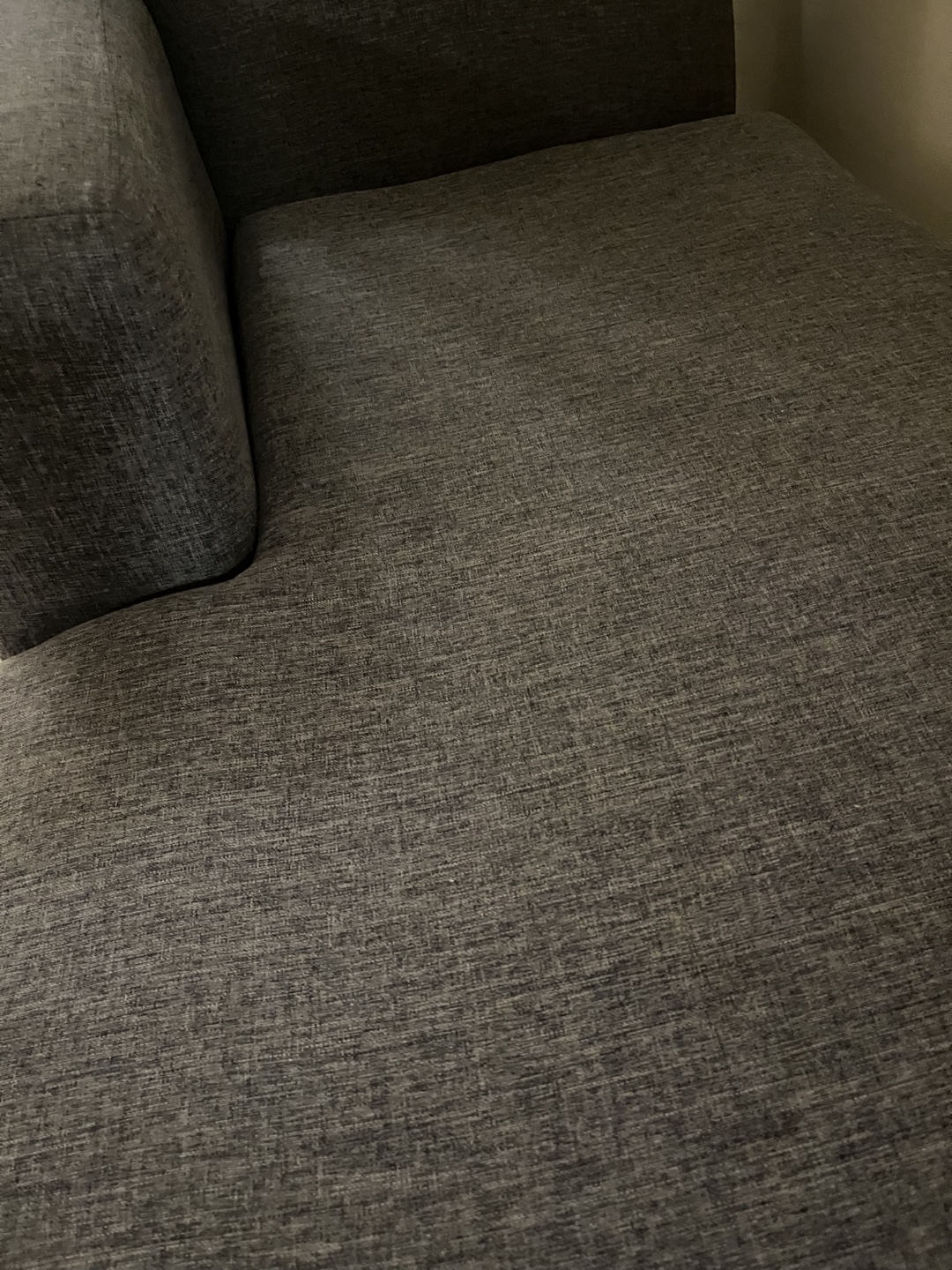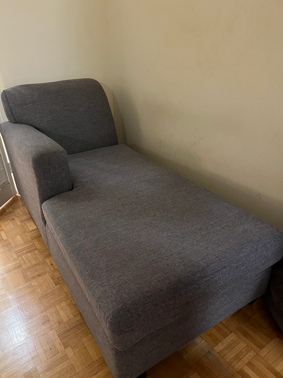 Comfortable chaise lounge. Dark grey fabric upholstery. Simple design. Solid wood legs. Good condition.