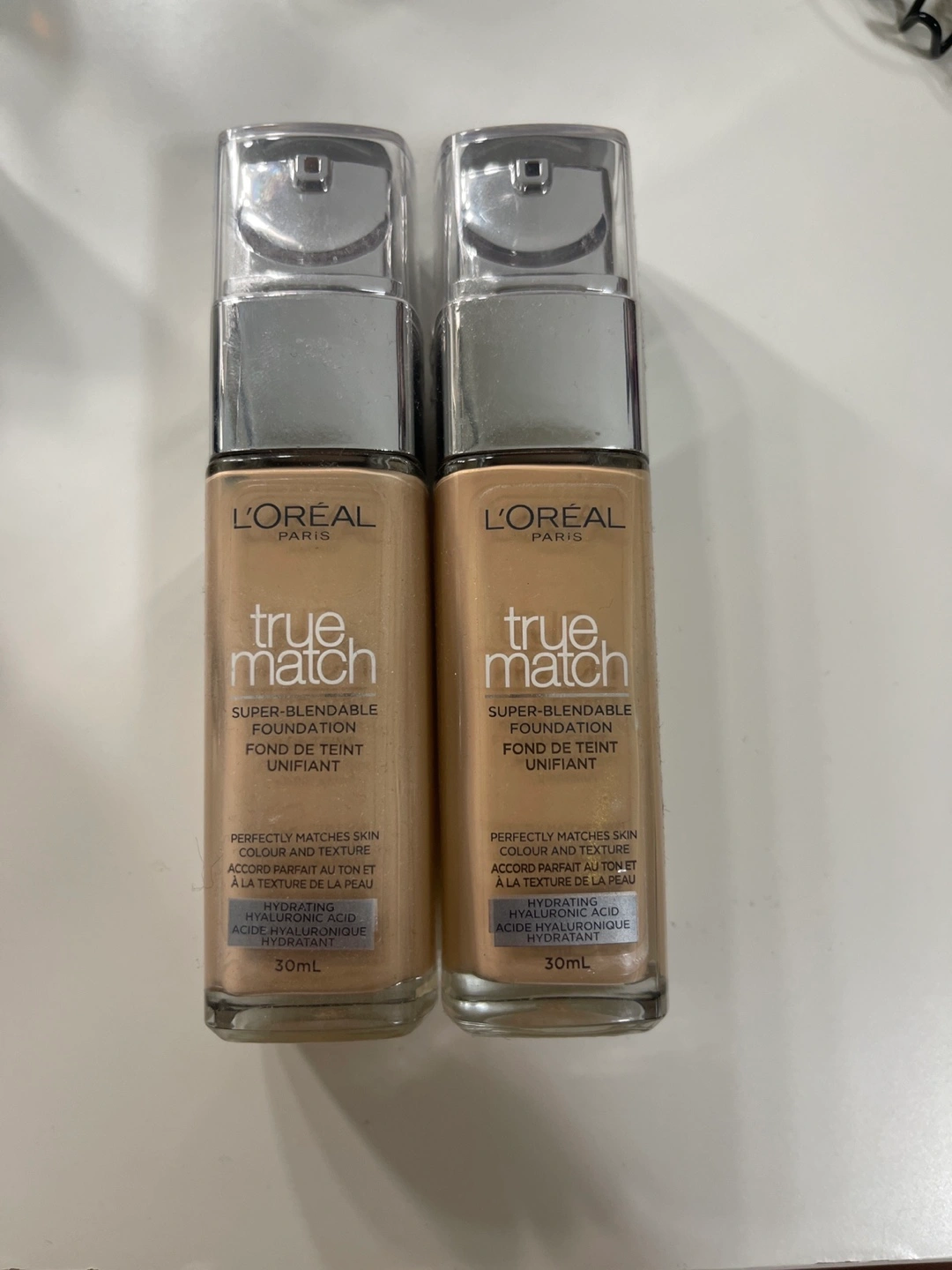 Two bottles of L'Oréal Paris True Match Super-Blendable Foundation. Shades 3.N Neutral and 3.5 D/3.5 W Warm. 30ml each. Hyaluronic acid and moisturizing care.