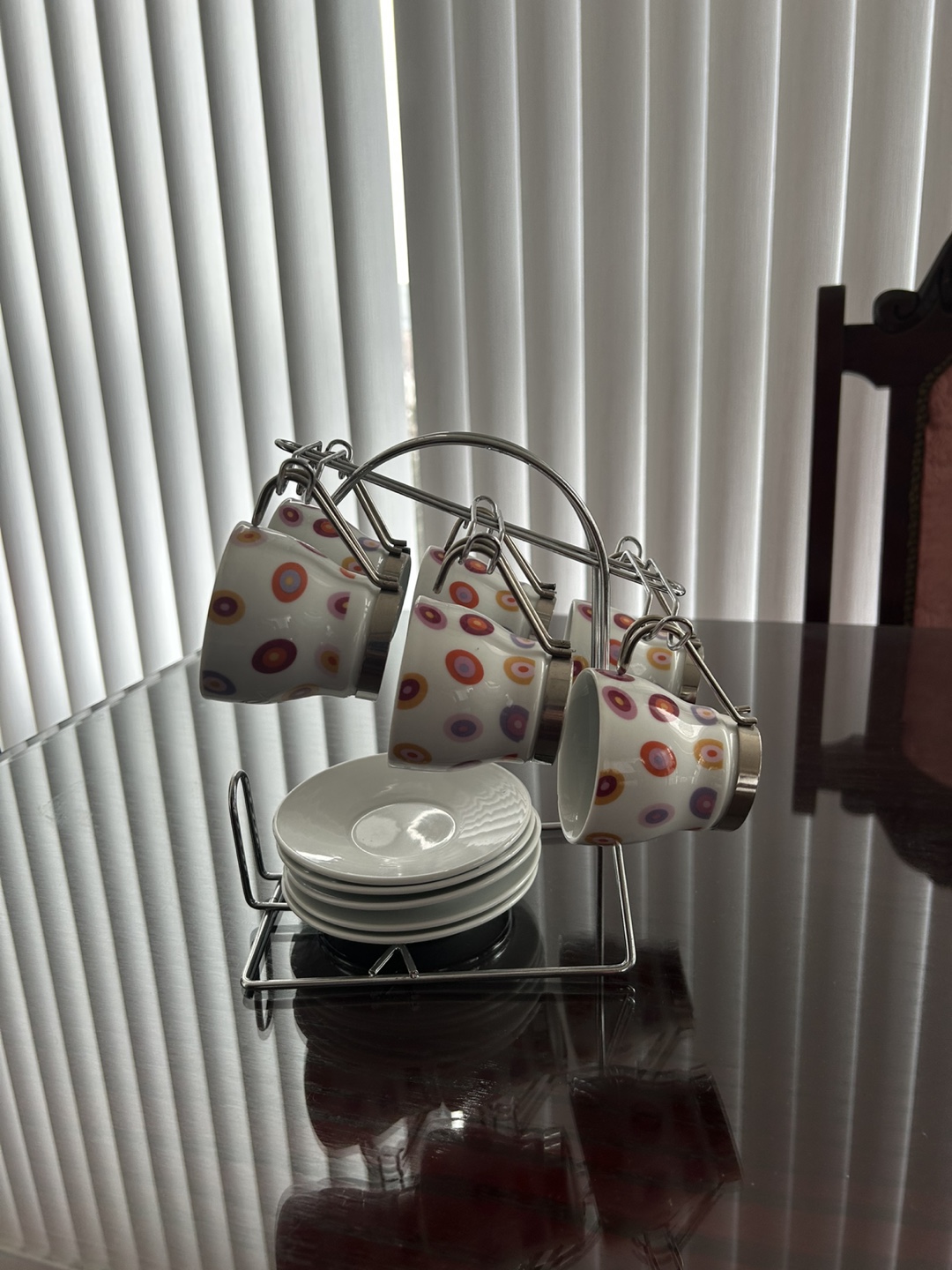 Six espresso cups and saucers. Colourful polka dot design. Chrome metal stand included. Excellent condition.