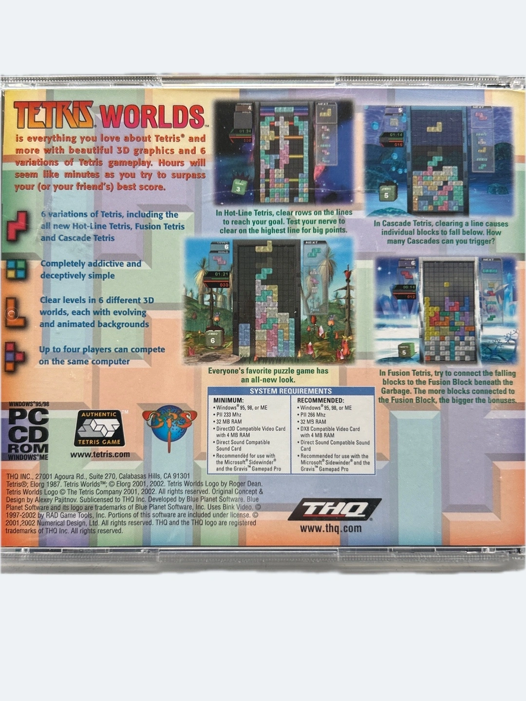 PC CD-ROM game. Includes 6 variations of Tetris gameplay. Features 3D graphics and multiplayer for up to four players. Rated E for Everyone. Absolutely free- no condition