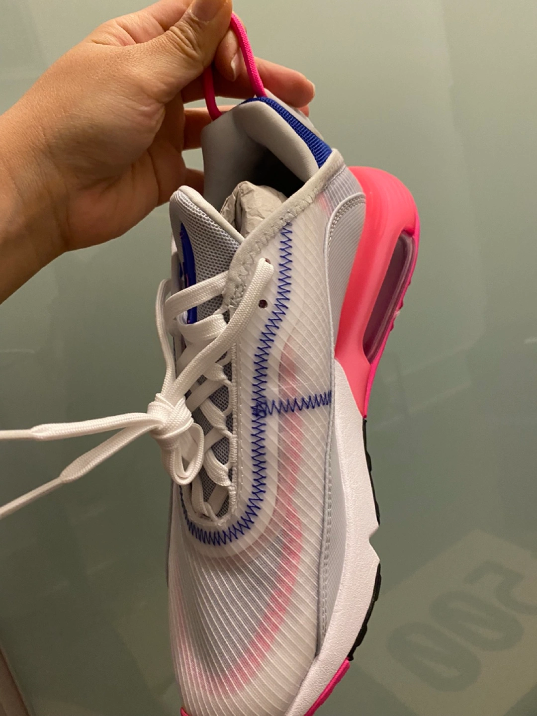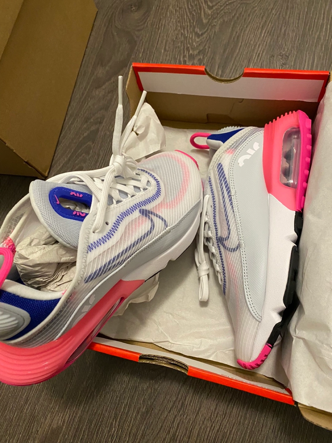 Women's Nike Air Max 2090 running shoes. White, pink, and blue colour scheme. Lightweight and breathable design. Great for everyday wear or workouts. Comes in original box.
