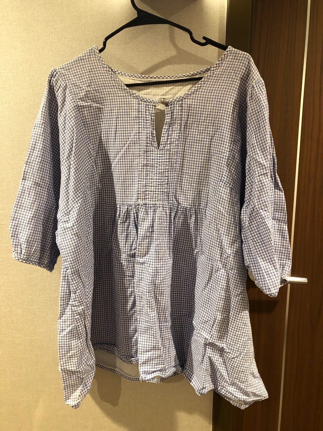 Women's blue and white gingham blouse. Three-quarter sleeves. Relaxed fit. Keyhole neckline. A-line silhouette.