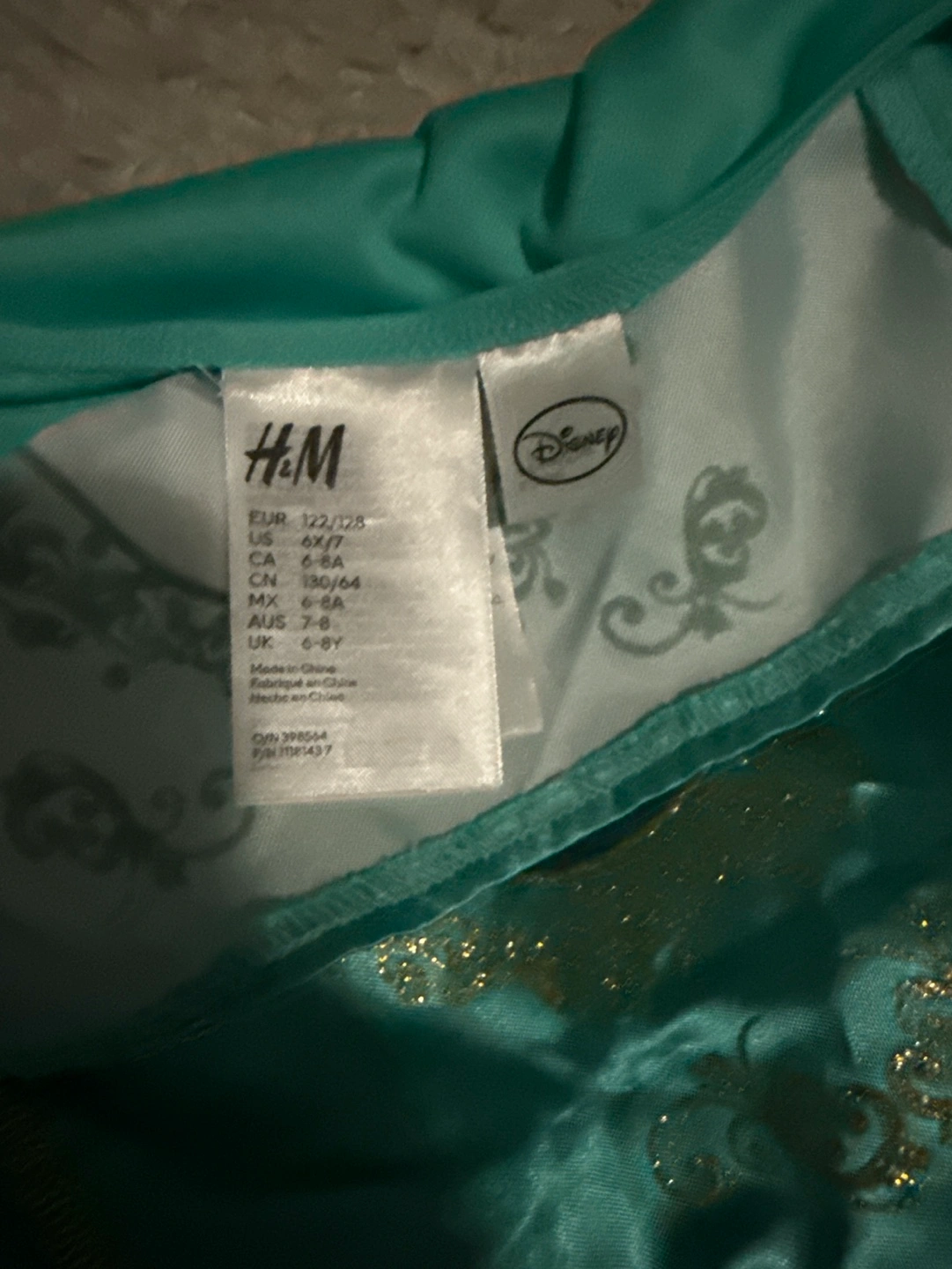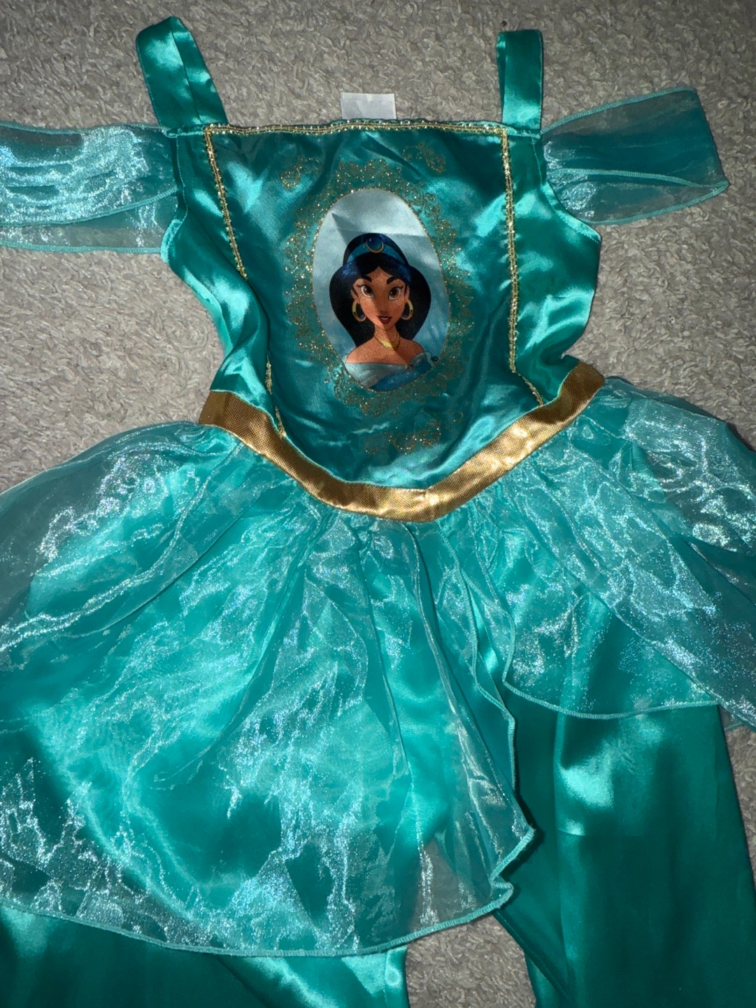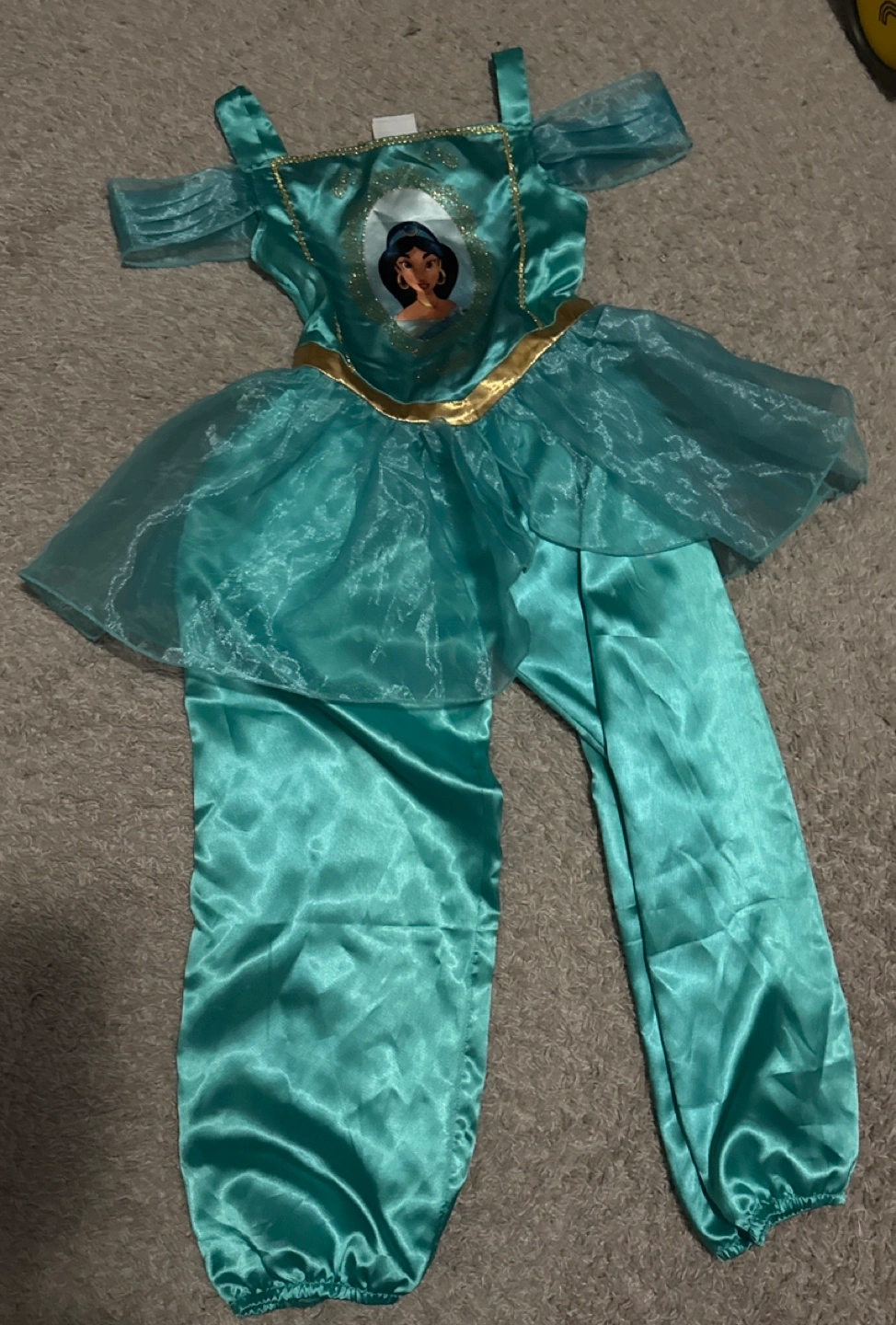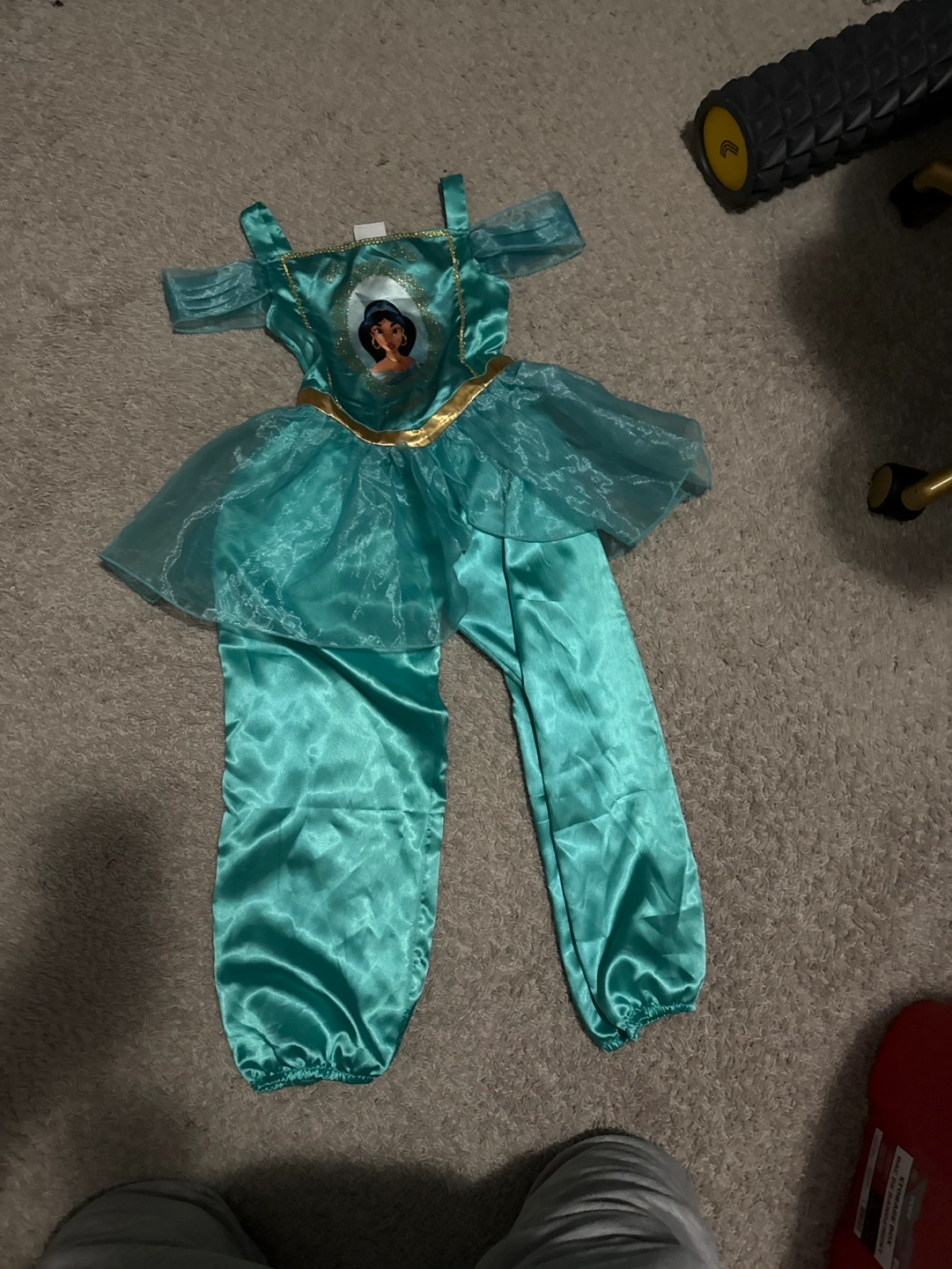 148Teal Princess Jasmine costume. Features a one-piece outfit with a sheer overlay. Suitable for dress-up or Halloween. Size 6-8 years. Smoke and Petfree Home. Serious Inquiries only. Pick up at Rosenthal.