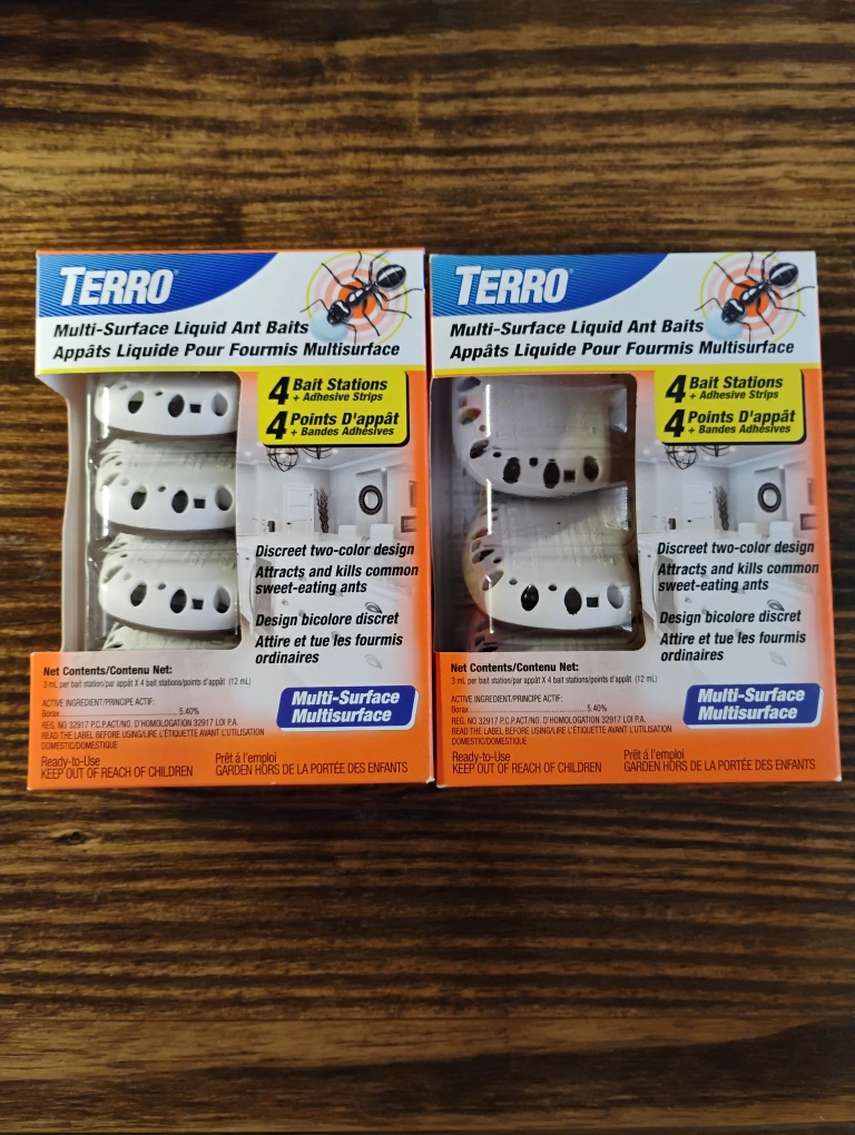 One full pack contains four bait stations and adhesive strips: $5. The other pack has three: $4.