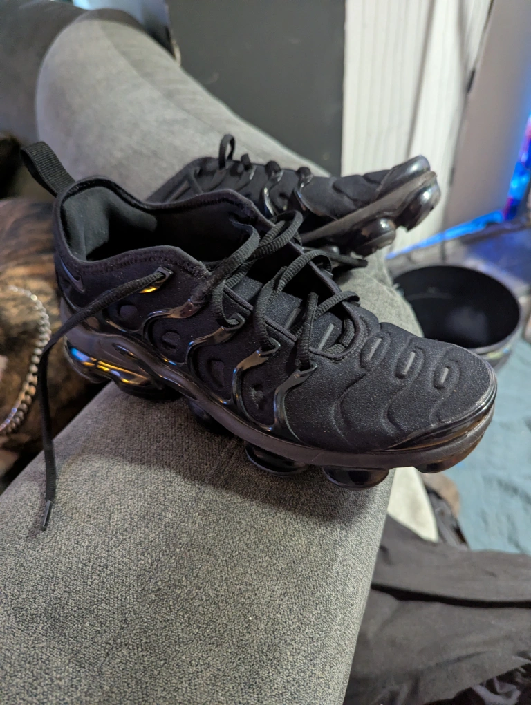 Never worn Nike Air Vapormax Plus running shoes. All black colourway. Excellent condition. Comfortable and stylish. Size 6