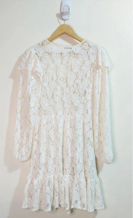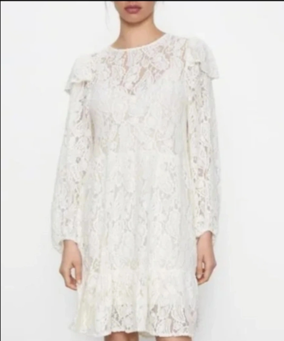 Beautiful cream coloured lace mini dress. Long sleeves, ruffle detailing on shoulders and hem. Relaxed fit. Perfect for a special occasion or a night out. Only worn once.