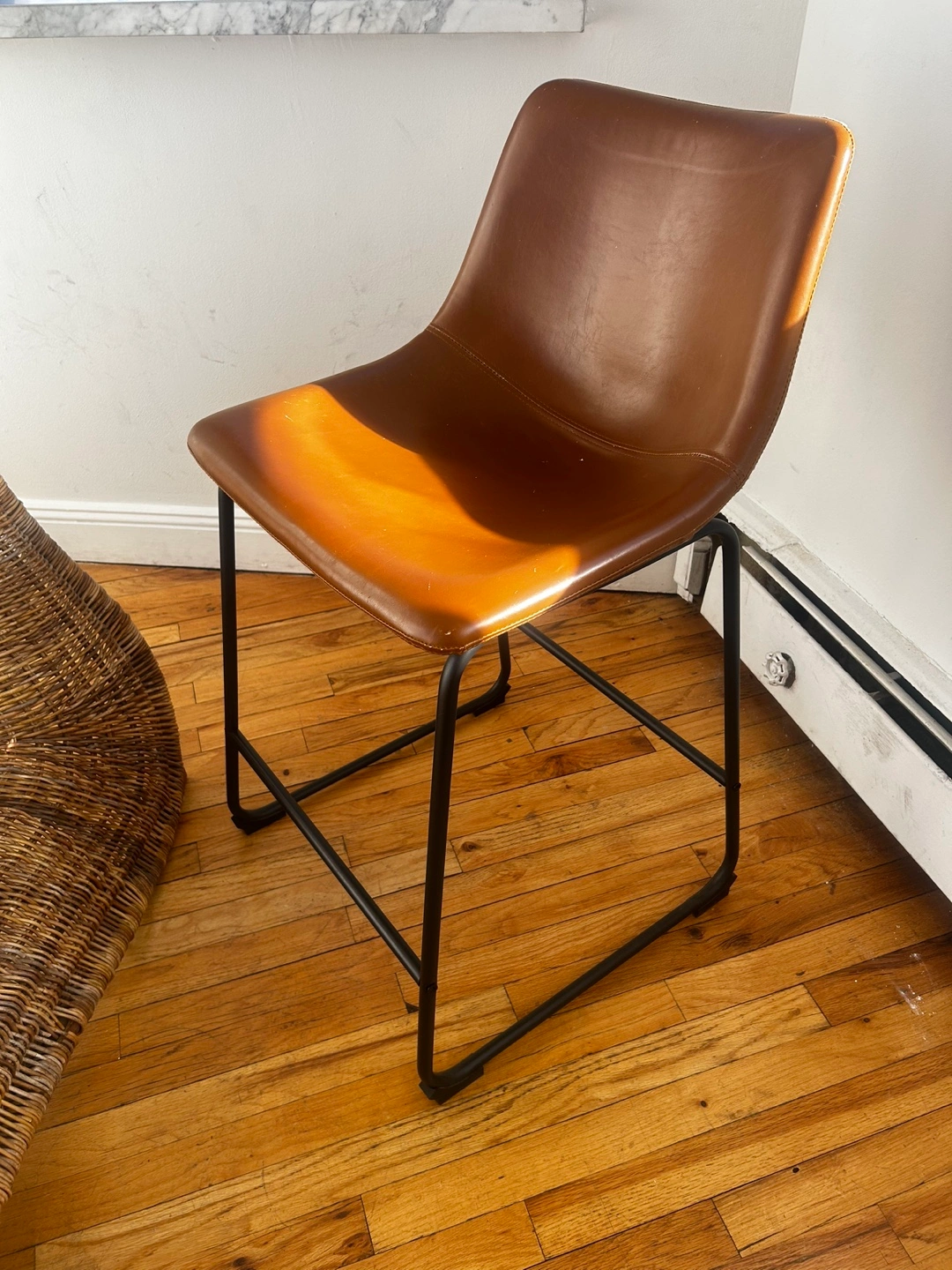 Brown Low Back Metal Frame Counter Height Bar Stool with Faux Leather Seat. Minor scuff on the seated part. Goes for $100 on the Home Depot website.