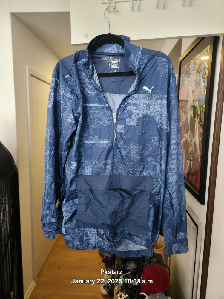 Men's Puma WindCELL jacket. Size large. Blue with abstract print. Lightweight. Zip-up front. Kangaroo pocket. Long sleeves.