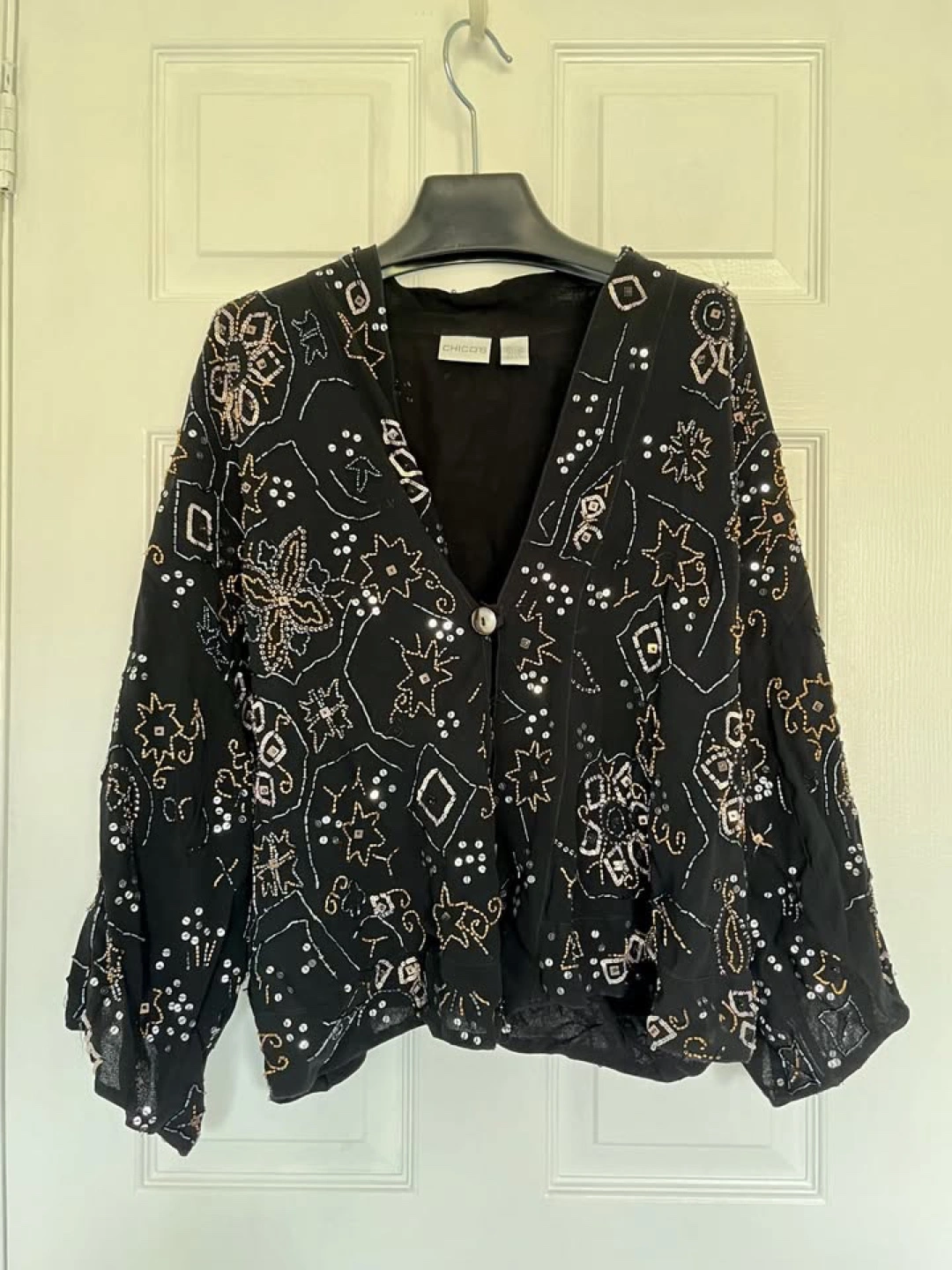 One button front closure. Kimono sleeves. Gold, silver and bronze beading and sequins. Size S/M (fits more like a large).