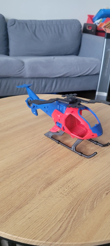 Toy helicopter, red and blue plastic. Features rotor blades and landing gear. Looks like it's for younger children.