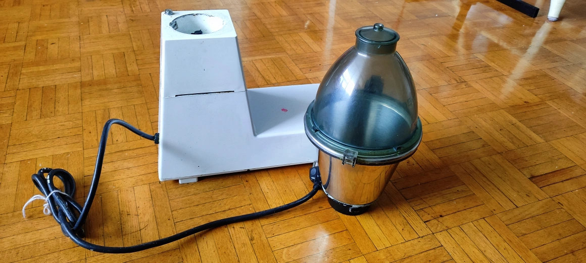 Vintage Sumeet mixer blender. Two-piece unit. Includes a metal mixing bowl with a clear plastic dome. Power cord included. Shows signs of use.
