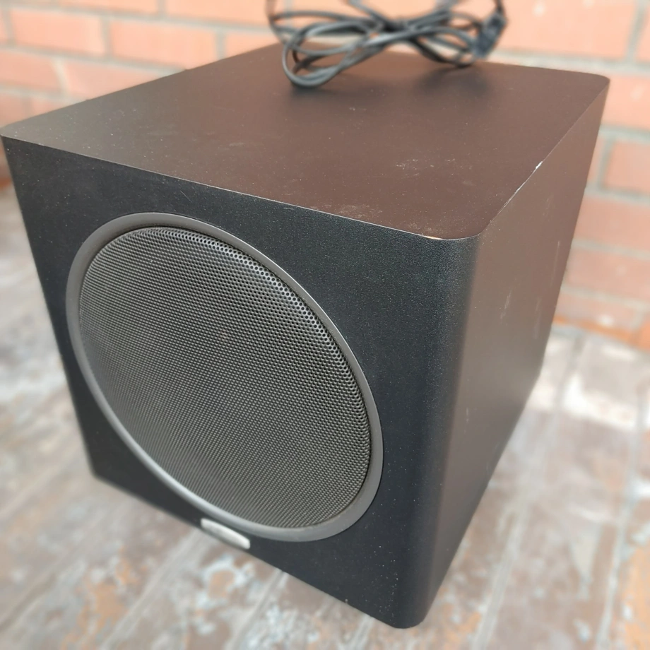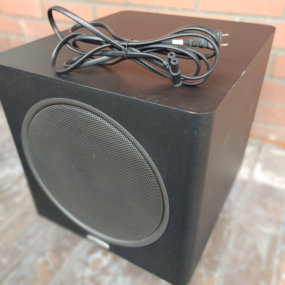 Black powered subwoofer. Includes power cable. Volume and other controls on the back. Good condition.