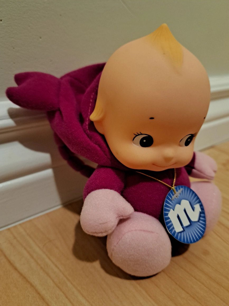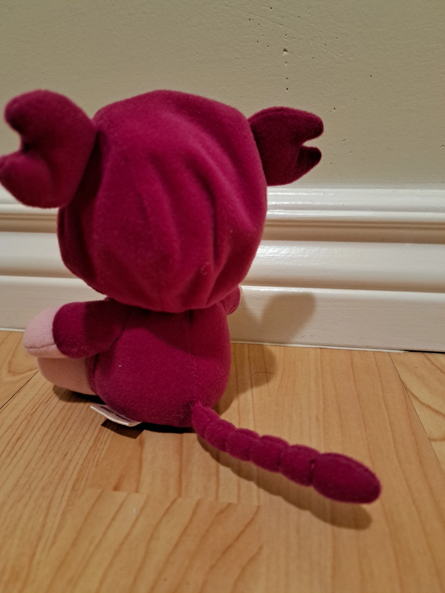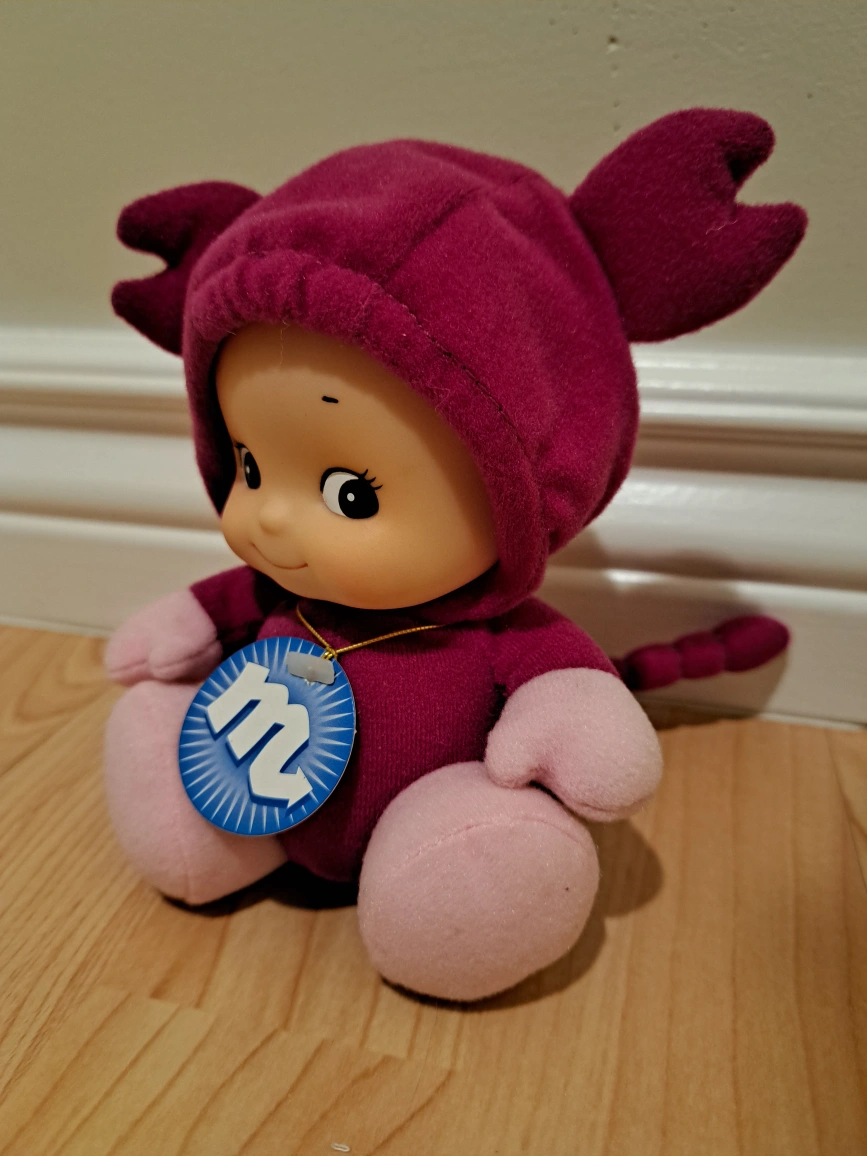 Collectible plush toy. Features a baby in a scorpion costume. Pink and purple. 5" tall. Good condition.
