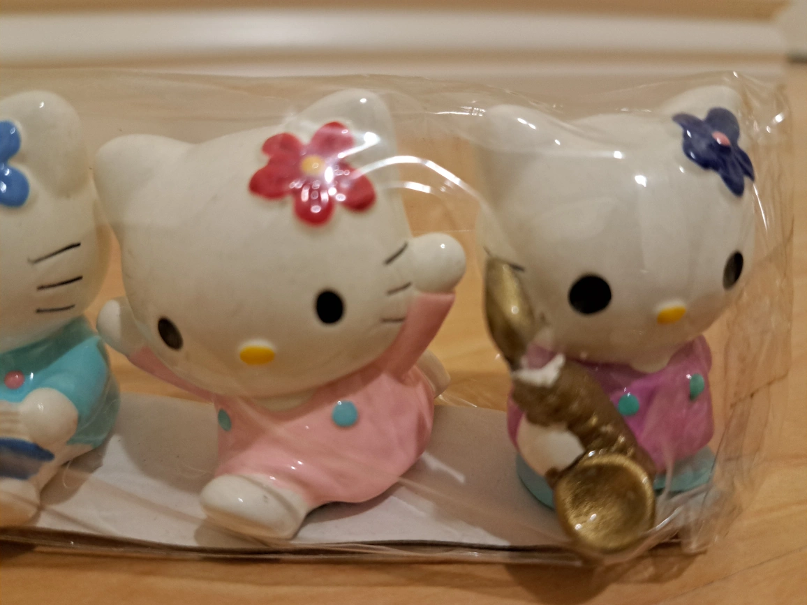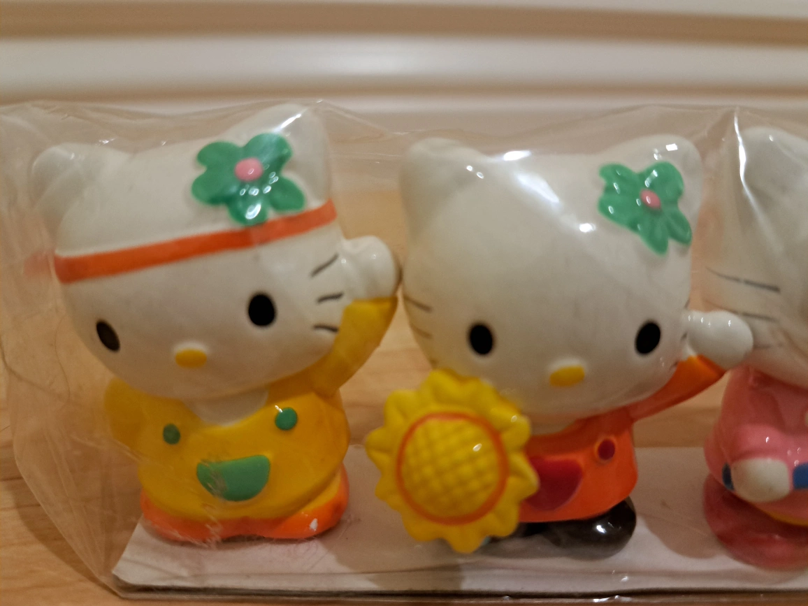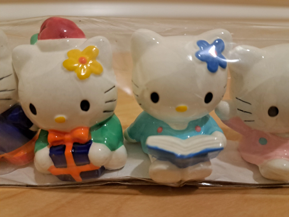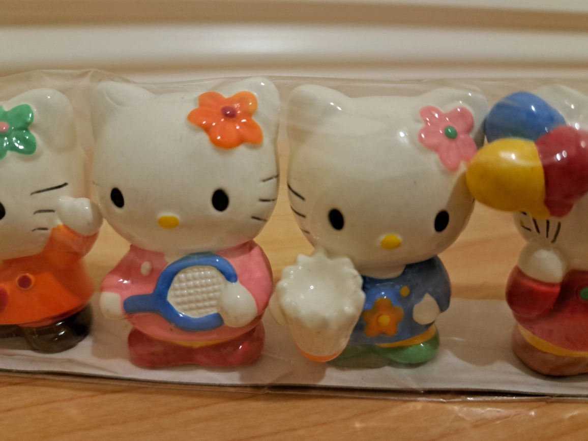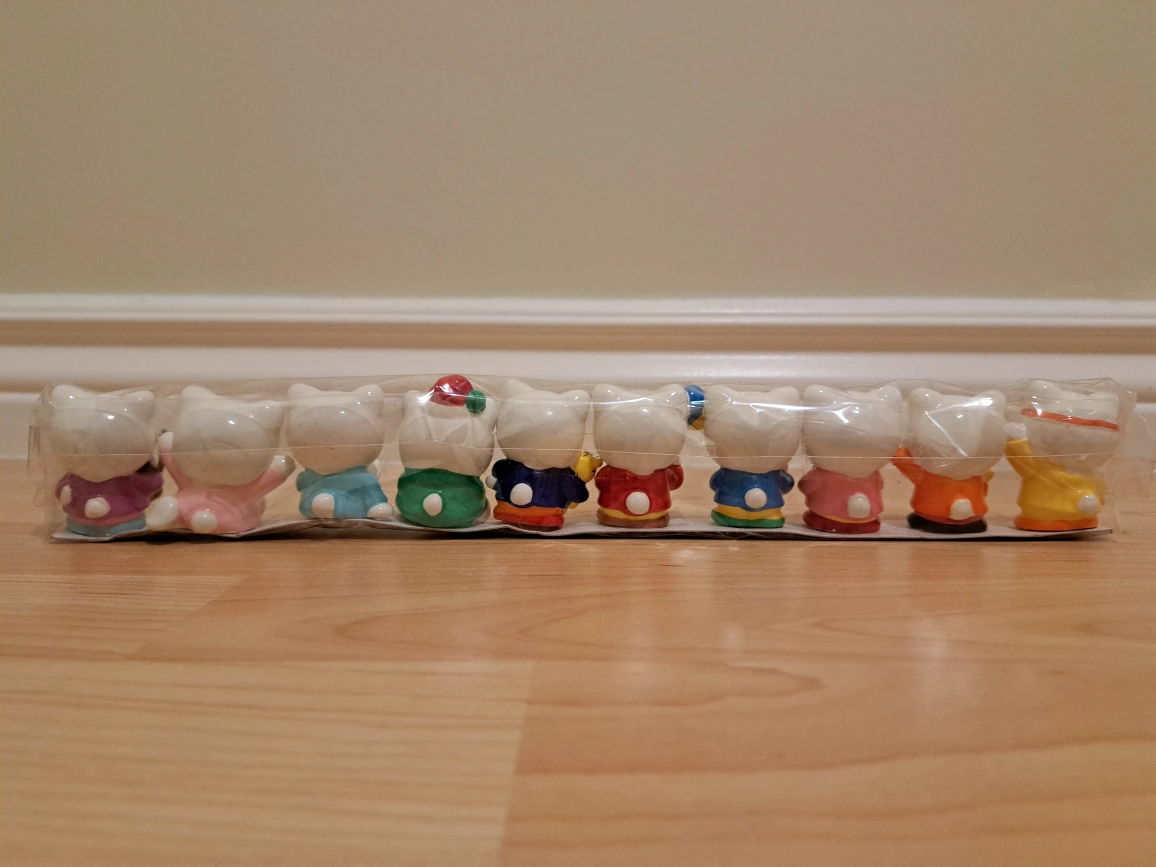 Adorable set of ten Hello Kitty figurines. Each figurine features Hello Kitty in a different outfit and pose. Collectible item, perfect for fans.