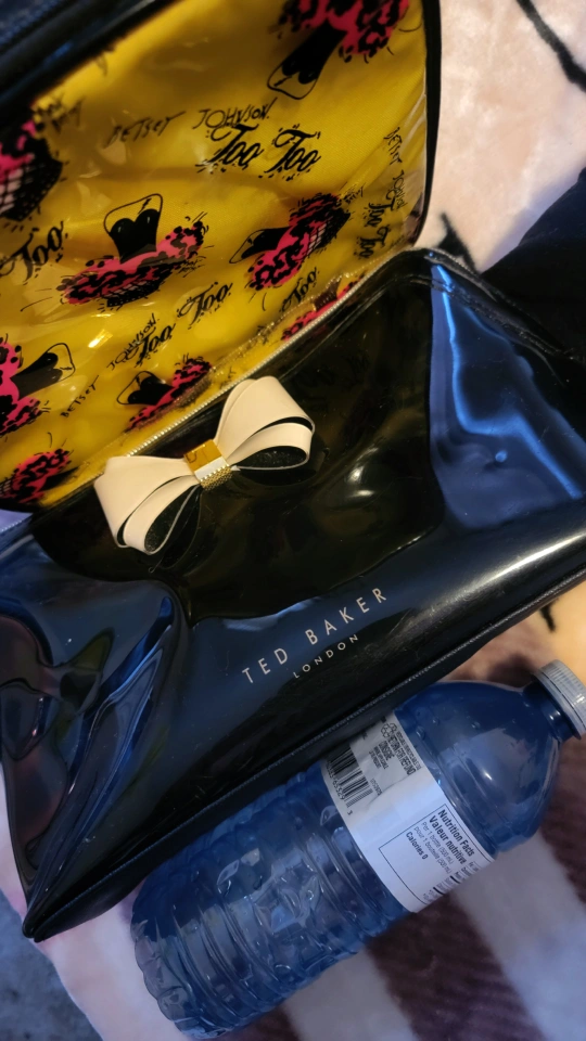 Glossy black patent cosmetic bag. Features a beige bow detail. Interior lining. (Water bottle for size)