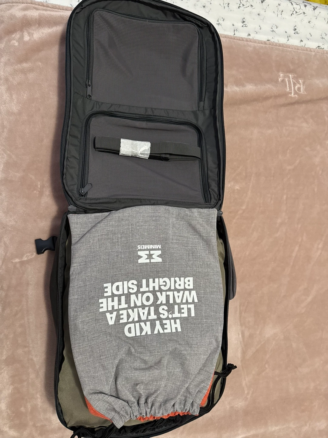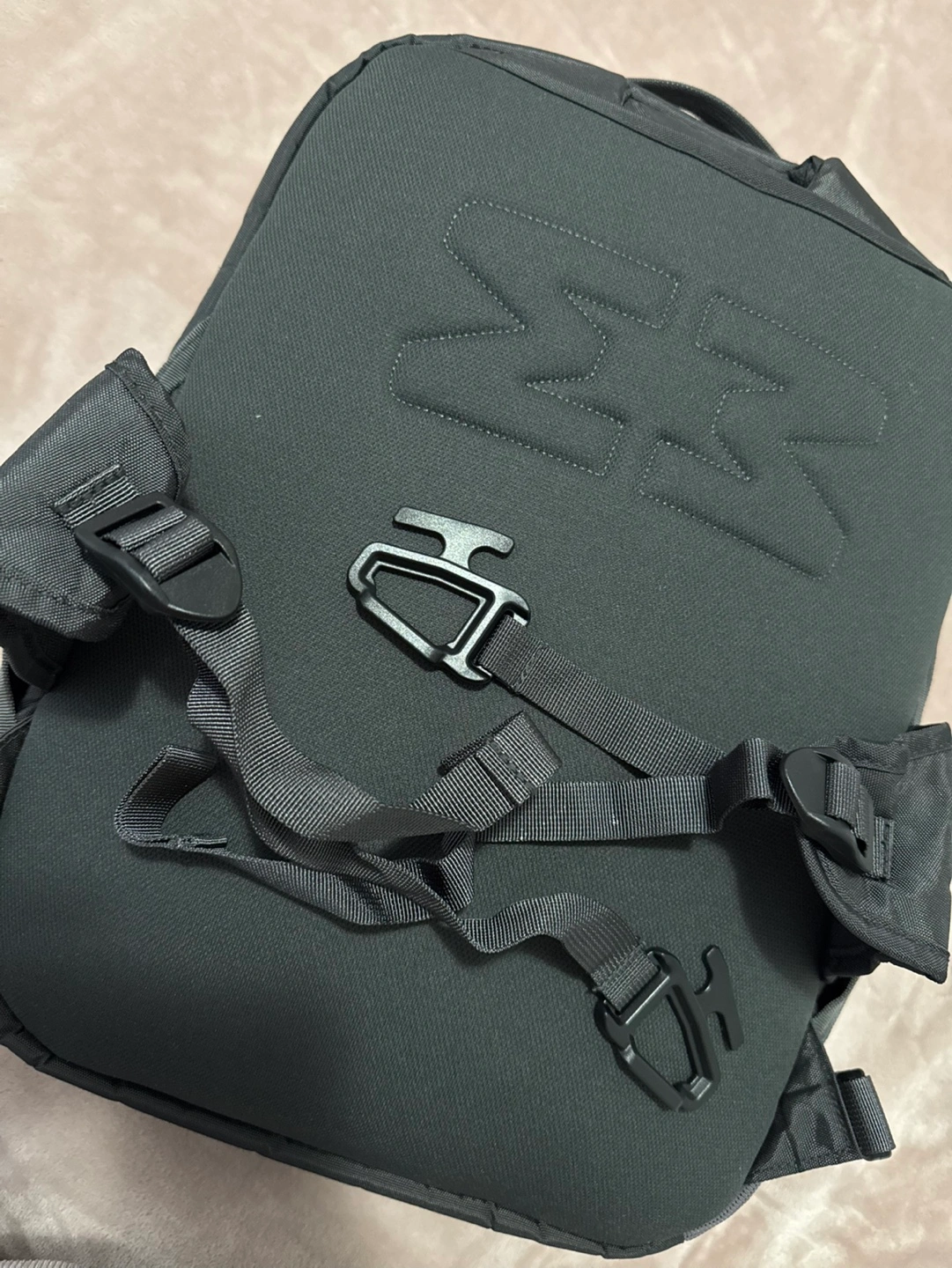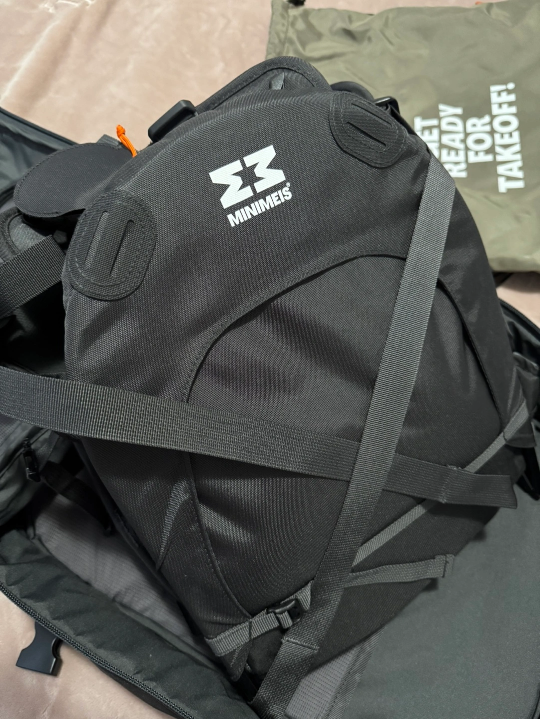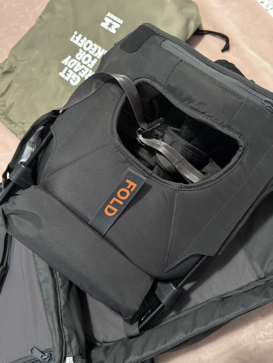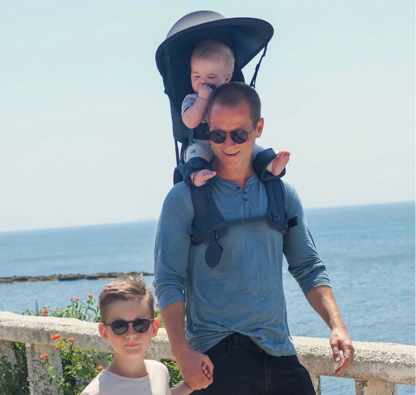 Black child carrier backpack with integrated sunshade. Includes carrying bag. Great for travel. Adjustable straps.