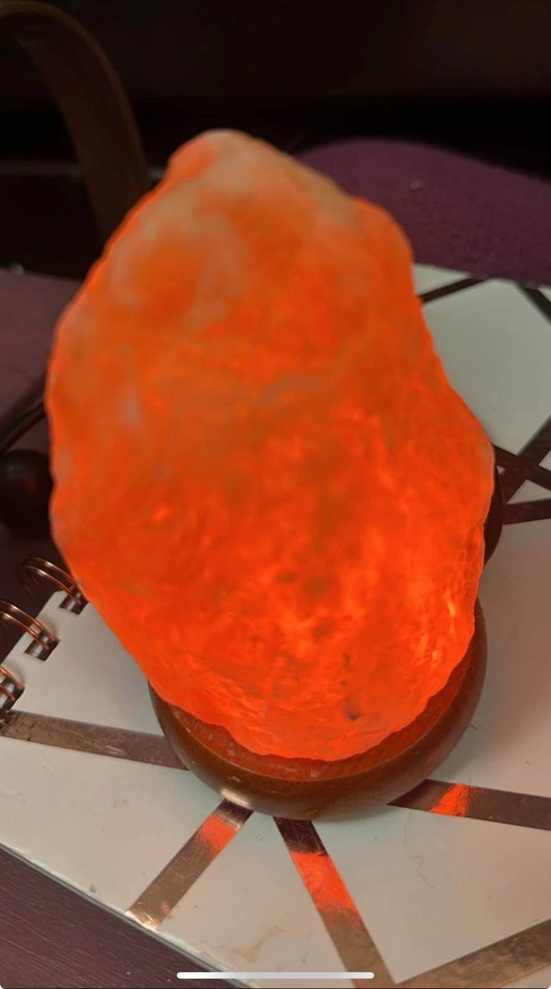 Beautiful orange Himalayan salt lamp. Unique shape. USB charging cable included. Creates a warm, ambient glow.