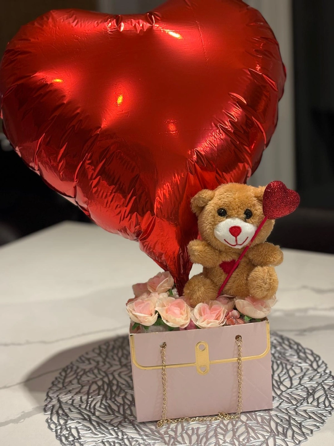 Valentine's Day Gift Box with Teddy Bear and Heart Balloon
