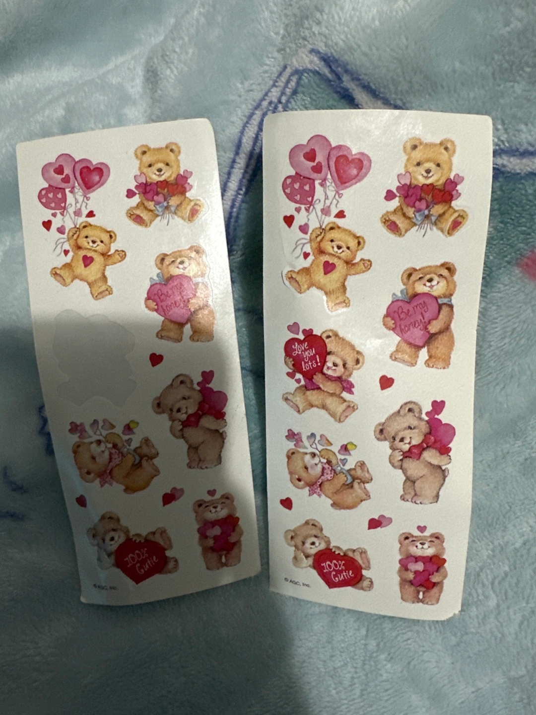 Two sheets of adorable vintage Valentine's Day stickers. Features cute teddy bears with hearts and balloons. Perfect for scrapbooking, cards, or decorating.